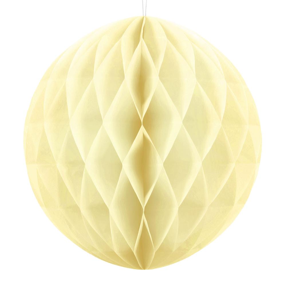 Hængende Honeycomb Halmgul 40 cm omfatter en kugleformet honeycomb i halmgul med klemmer for nem montering og en hvid snor til ophængning.