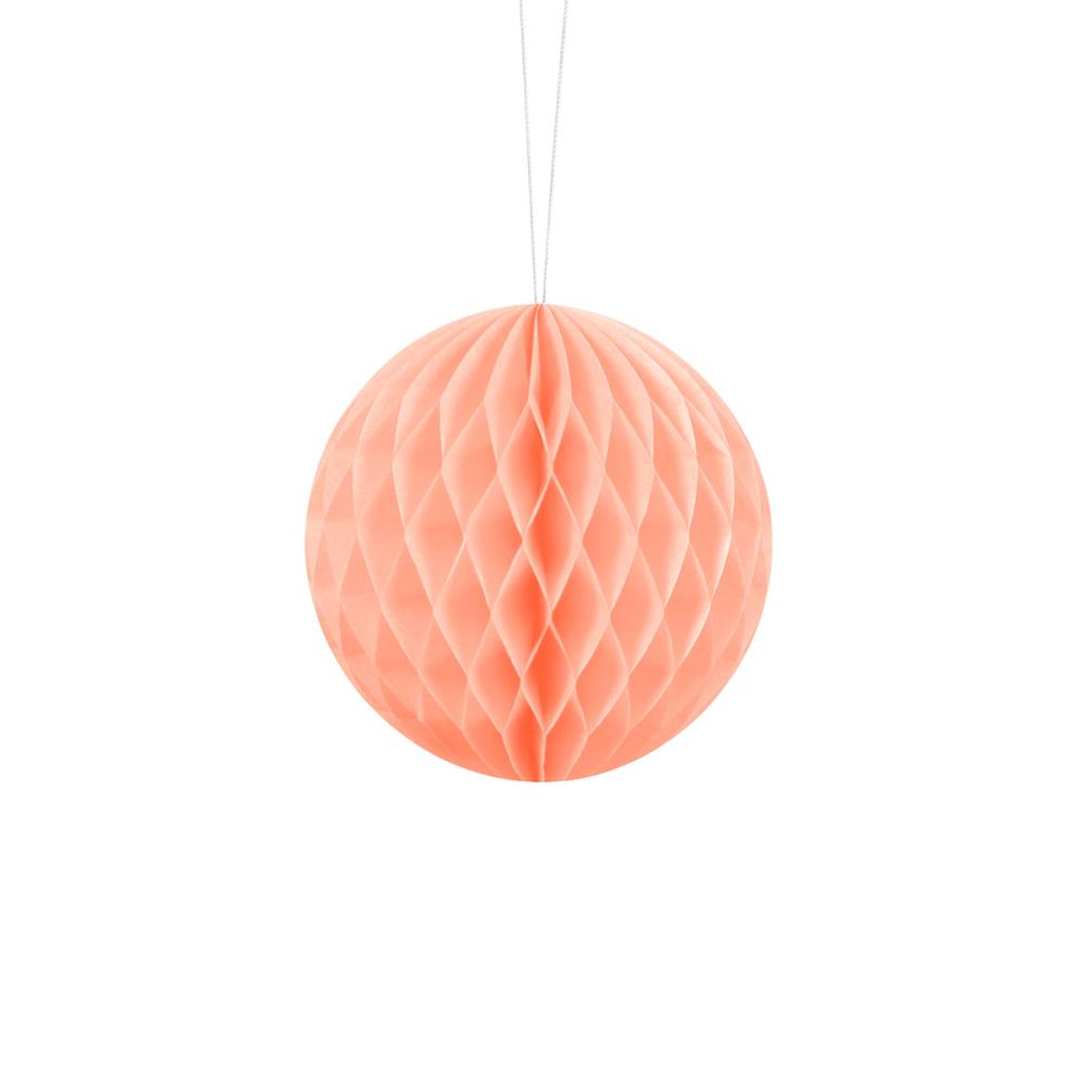 Hængende Honeycomb Lys Fersken 10 cm omfatter en kugleformet honeycomb i lys ferskenfarve med klemmer til nem montering og en hvid snor til ophængning.