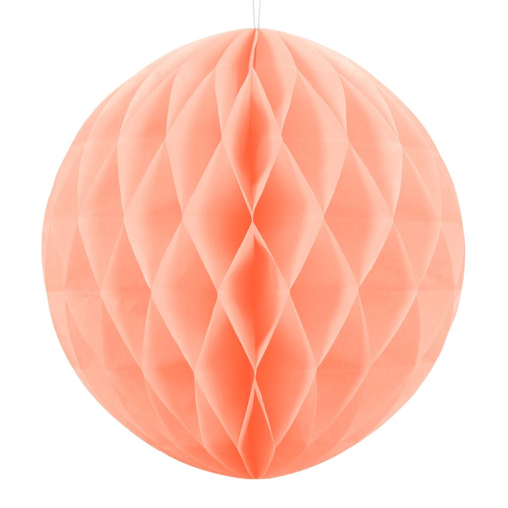 Hængende Honeycomb Lys Fersken 40 cm omfatter en kugleformet honeycomb i lys ferskenfarve med klemmer til nem montering og en hvid snor til ophængning.