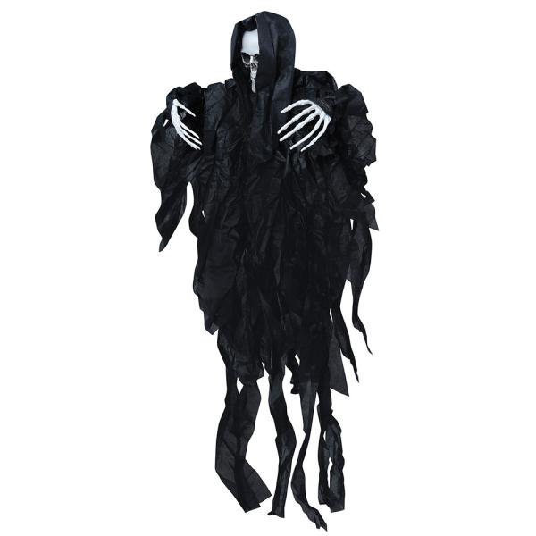 Forhøj din halloween med en hængende dekoration i form af et skelet, der virkelig imponerer. Dette 75 cm lange skelet har en hvid dødningehoved, samt bevægelig kæbe og arme.