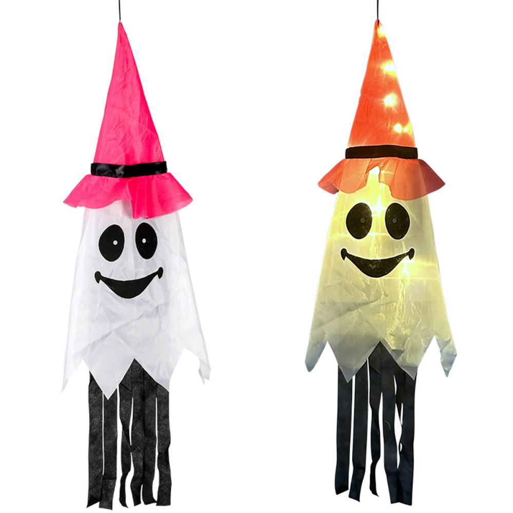 Hængende Spøgelse med LED-lys 100 cm omfatter en hængende dekoration i form af et hvidt spøgelse med lyserød heksehat og sorte stofstrimler, der hænger ned for en spøgelsesagtig effekt. Når dekorationen aktiveres, lyser flere indbyggede LED-lamper figuren op og skaber en stemningsfuld belysning.