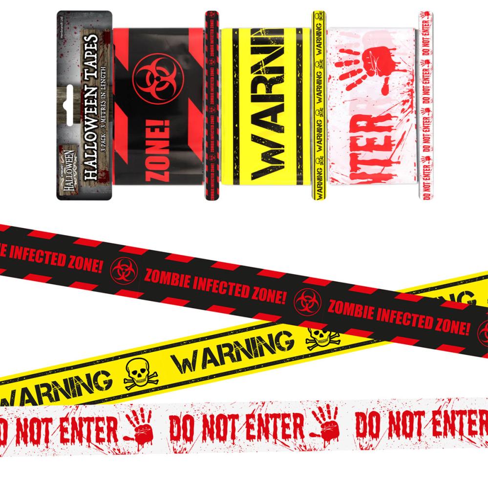 Halloween Afspærringsbånd 3-pak indeholder tre afspærringsbånd i sort med den røde tekst "ZOMBIE INFECTED ZONE!" og et biohazardsymbol, i gult med den sorte tekst "WARNING" og et dødningehoved samt i hvidt med den røde tekst "DO NOT ENTER" og en blodig hånd.