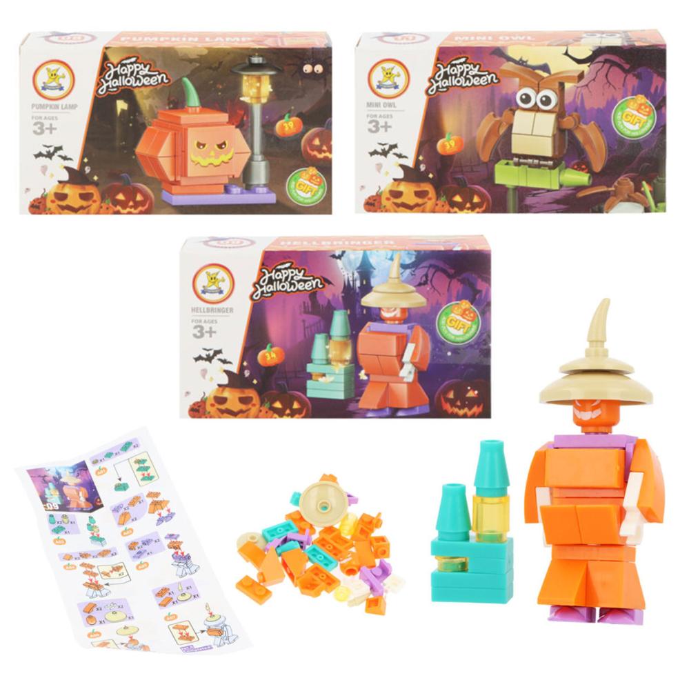 Halloween Byggeklodser består af byggeklodser til at bygge en af tolv figurer med halloweenmotiv, heriblandt træmonster, flagermus, edderkoppeslot, pendulur, monster med store øjne, gravsten, græskarlampe, helvedesbringer, monster, miniugle og monstergris. Saml alle tolv figurer for at bygge et spøgelseshus.