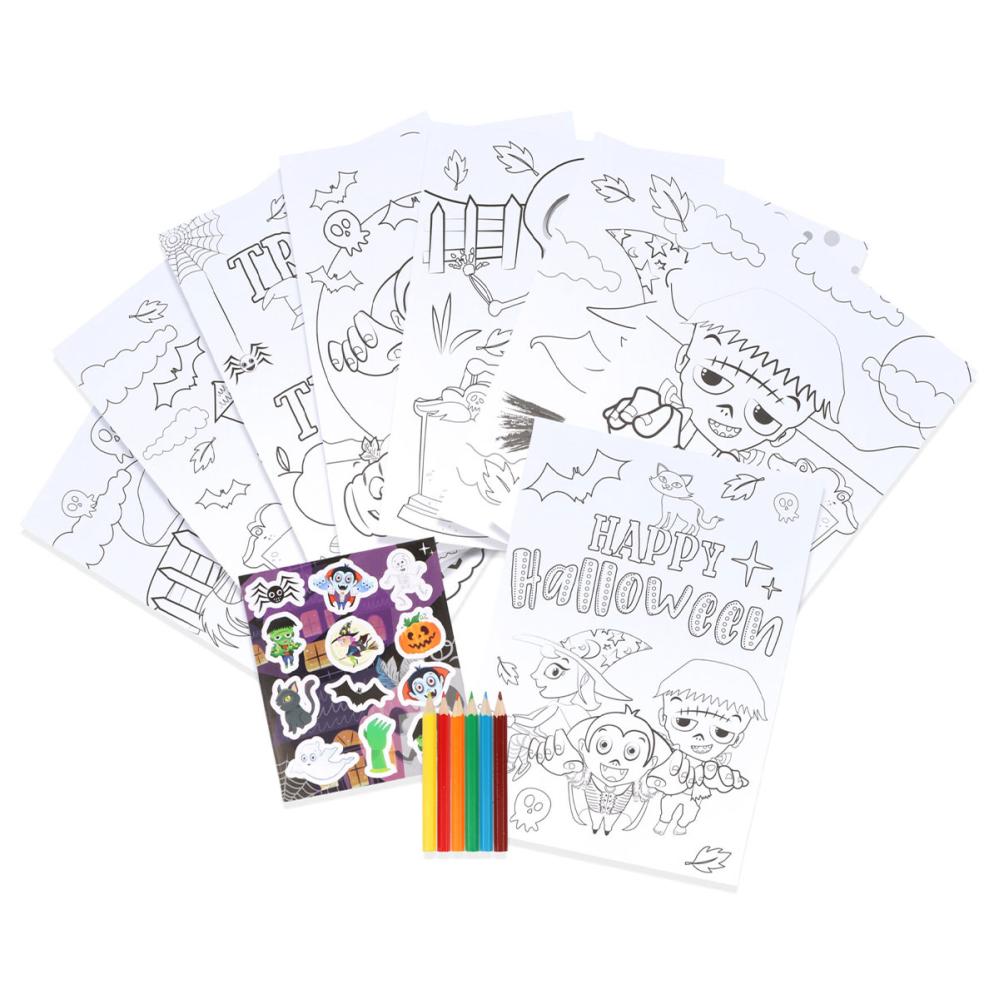 Dette hobbysæt med farvelægning er fyldt med skræmmende og sjove Halloween-motiver, seks farveblyanter og klistermærker. Børn elsker at bruge dette kreative Halloween-tegnesæt til at skabe egne dekorationer og uhyggelige kreationer.