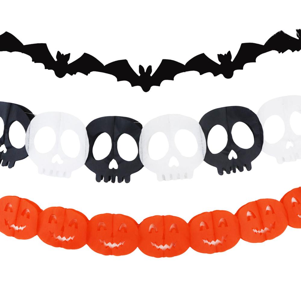 Halloween Guirlande 3-pak omfatter et sæt med tre papirguirlander, der har farve og form som et orange halloween-græskar, en sort flagermus samt sorte og hvide dødningehoveder. Hver guirlande sidder på en tynd, hvid snor.