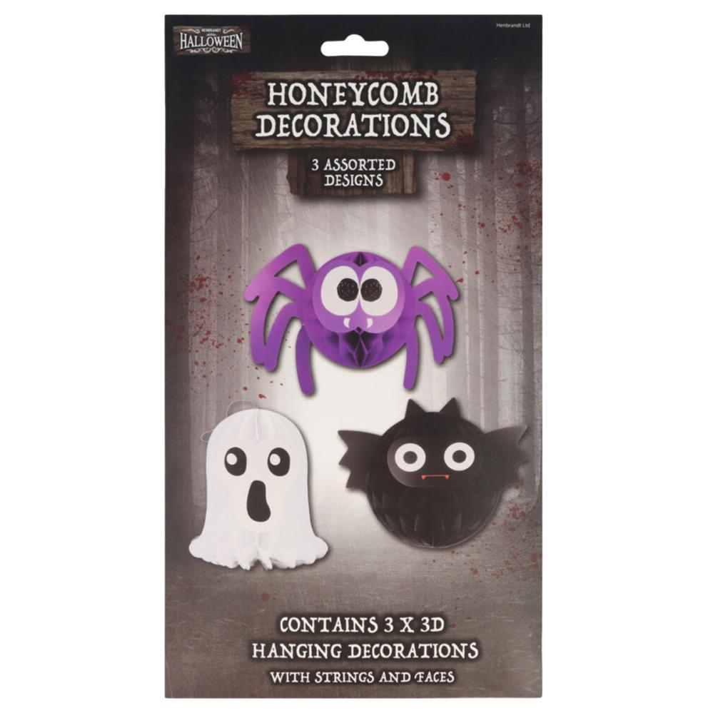 Halloween Honeycomb Dekorationer 3-pak indeholder tre forskellige honeycombs med motiv af et hvidt spøgelse, en lilla edderkop og en sort flagermus, alle klar til at blive hængt op i de medfølgende, fastgjorte snore. Man sætter selv ansigterne på figurerne, hvilket nemt gøres ved hjælp af de medfølgende klistermærker. Sættet leveres også med papirclips for at holde dekorationerne samlet.