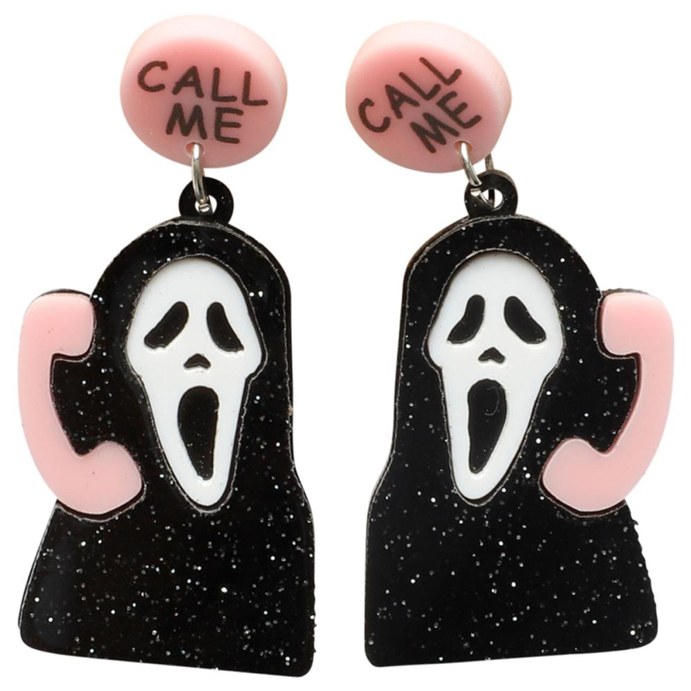 Halloween Øreringe Scream Call Me omfatter et par sjove stiftøreringe, der forestiller Ghostface-spøgelset fra Scream-filmene, med en lyserød telefon og en glitrende finish kun på den sorte del, samt teksten 'Call me' på en separat hængende rund del.