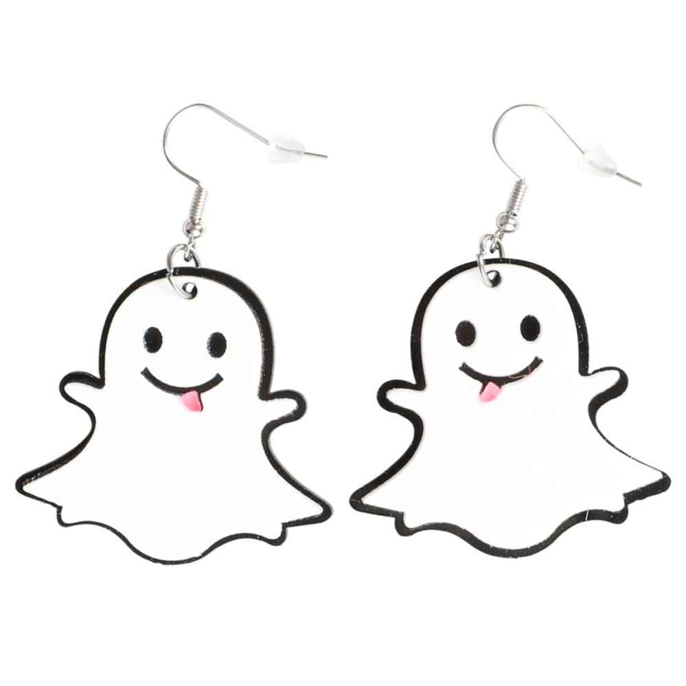 Halloween Øreringe Søde Spøgelser omfatter et par krogøreringe, der forestiller smilende hvide spøgelser, kompletteret med udstående tunger for et legefuldt præg.