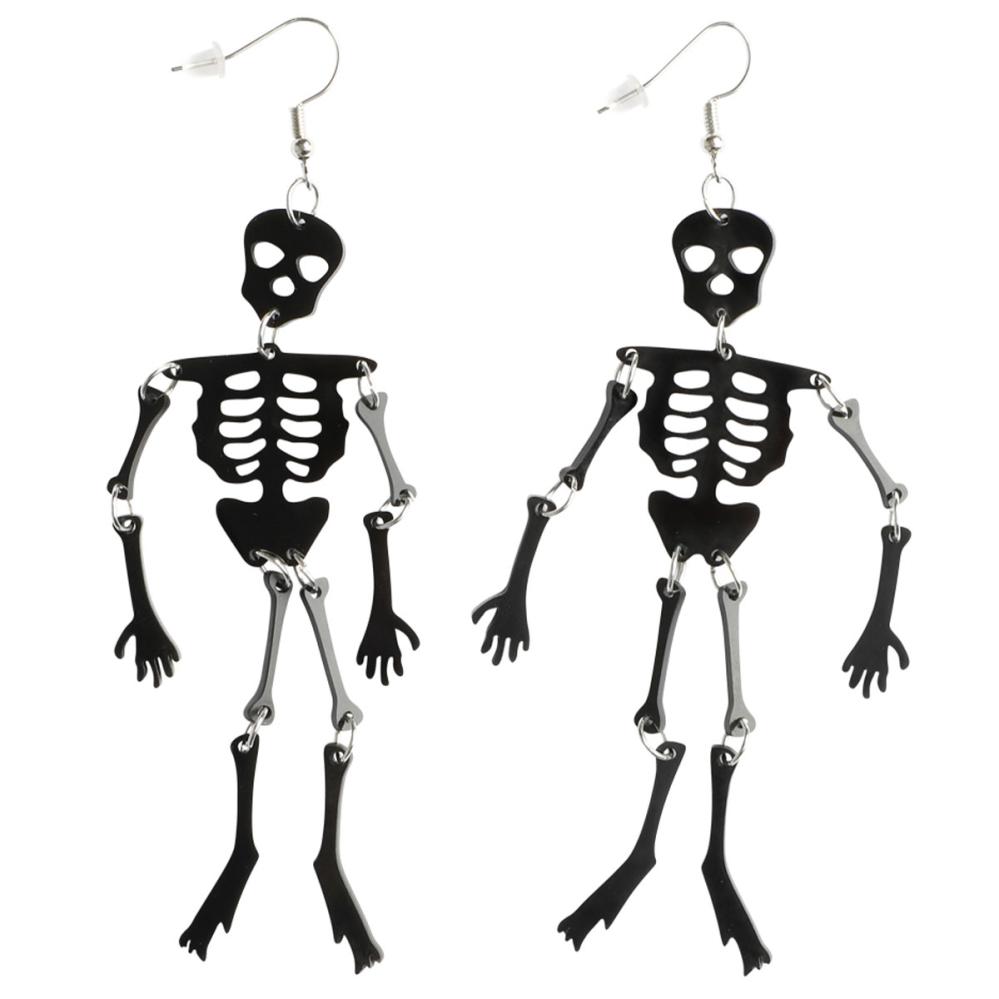 Halloween Øreringe Sorte Skeletter omfatter et par lange krogøreringe i form af sorte skeletter. De er fremstillet i let akryl, som gør dem behagelige at bære trods størrelsen.
