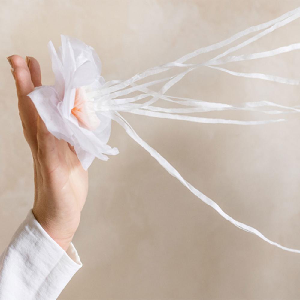 Hånd Serpentiner Blomster 10-pak indeholder ti håndholdte blomster i hvid, som skyder hvide papirsserpentiner ud, når den hvide snor trækkes ud.