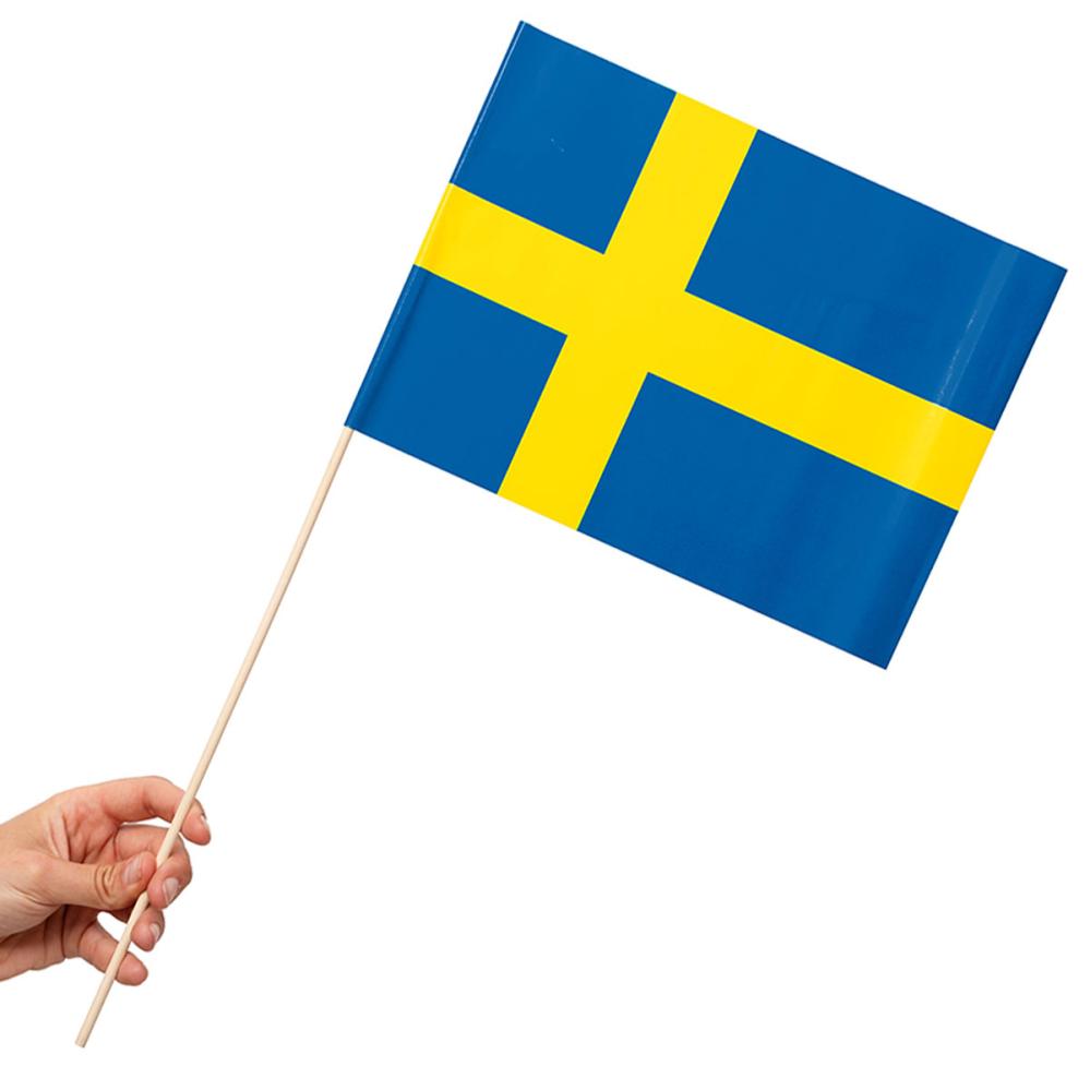 Håndflag Sverige 50 cm 10-pak indeholder ti Sverigeflag i papir med dobbeltsidet tryk, hvor hvert flag sidder på en træpind.