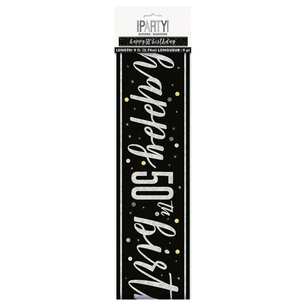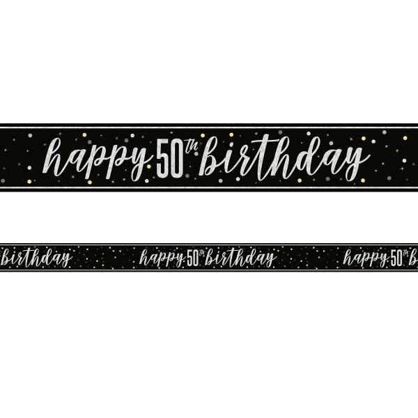 Happy 50th Birthday Guirlande Sort 2,74 m er en sort guirlande med teksten "Happy 50th Birthday" i holografisk sølv.