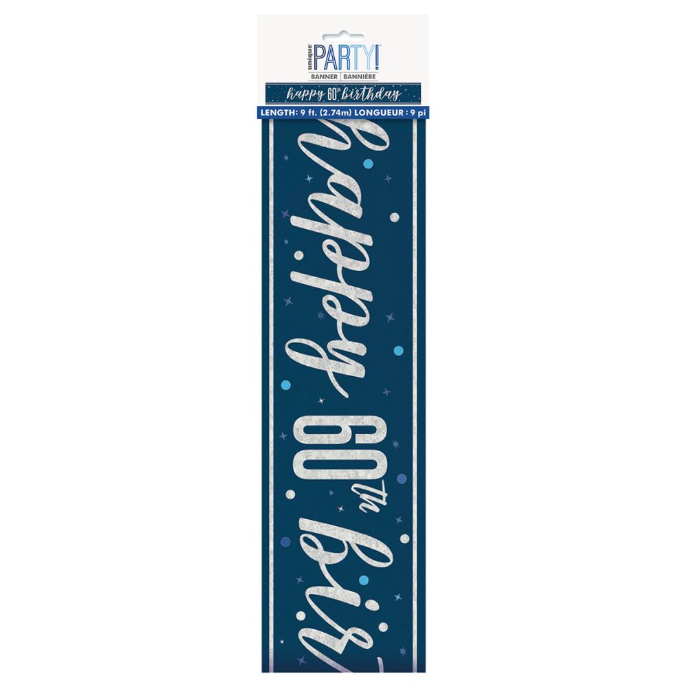 Happy 60th Birthday Banner Blåt & Sølv inkluderer en banner i lyseblå med prikker i hvid, sølv og blå og holografisk sølvfarvet bagside og teksten "Happy 60th birthday". Banneren er ca. 2,74 meter lang og 13 cm høj. Fremstillet i tynd plast.