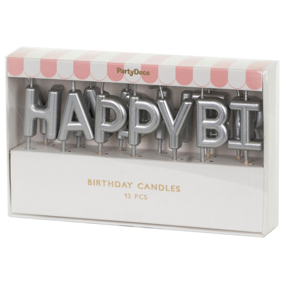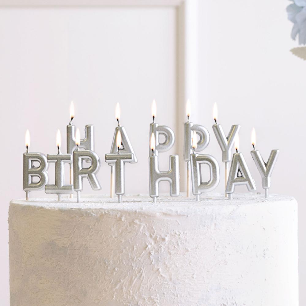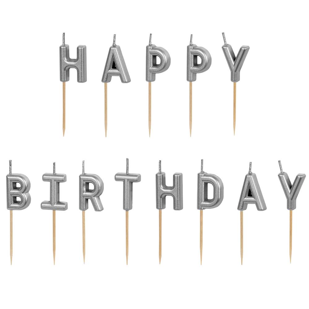 Happy Birthday Bogstavlys Sølv består af tretten bogstavformede kagelys, som danner teksten "HAPPY BIRTHDAY" i sølv.