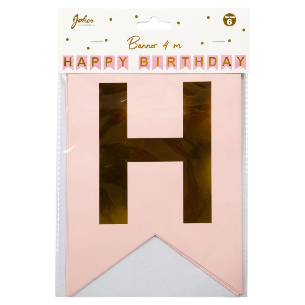 Happy Birthday Flagguirlande Pink omfatter en 4 meter lang guirlande med 13 stk. rosa papirflag med gyldne bogstaver, der danner teksten "Happy Birthday". Flagene er ca. 17 x 23 cm store.