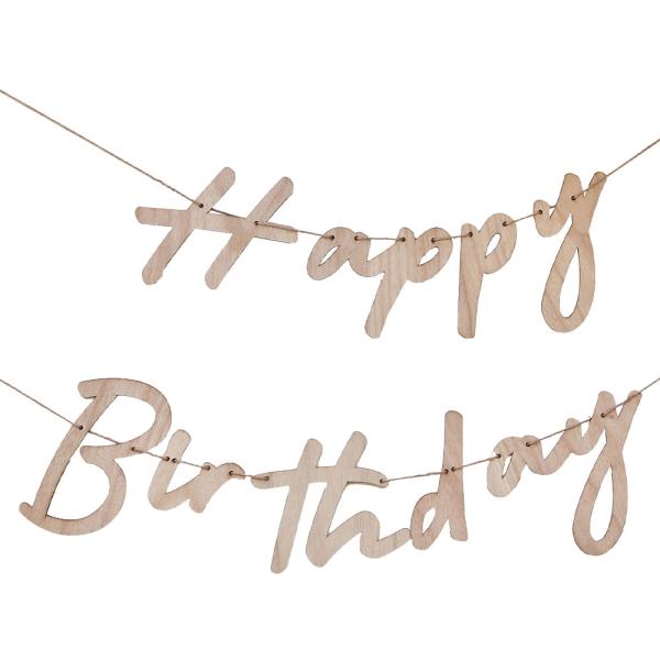 Happy Birthday Guirlande Træ omfatter en Happy Birthday guirlande af træ. Guirlanden er i to dele, der er ca. 150 cm lange. Guirlanden kan også genanvendes.