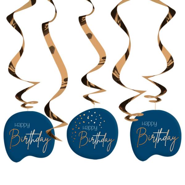 Happy Birthday Hængende Pynt Mørkeblå omfatter 5 stykker gyldne swirls, hvoraf tre af dem har mørkeblå hængende dekorationer med teksten "Happy Birthday" i lyseblåt og guld. Swirls dekorationerne har ophængningsøjer af plastik.