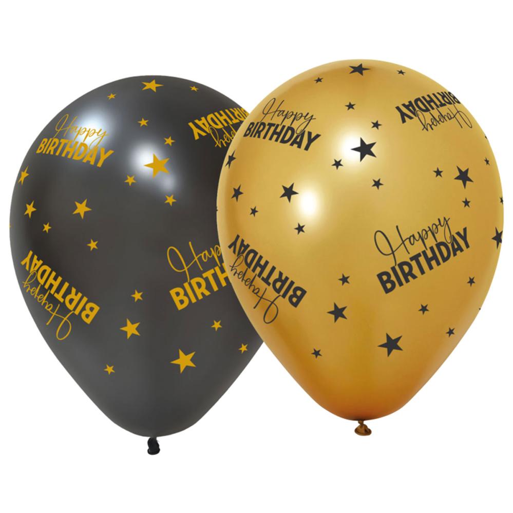 Happy Birthday Latexballoner med Stjerner 6-pak indeholder seks latexballoner, hvoraf tre har stjerner og teksten "Happy Birthday" i sort på guldfarvet baggrund, og de andre tre har samme motiv i omvendte farver.