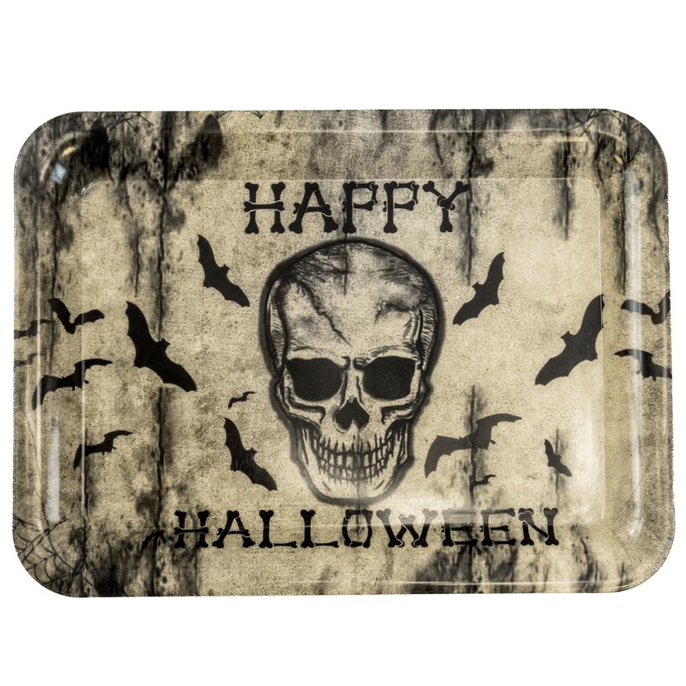 Happy Halloween Serveringsbakke er en benhvid serveringsbakke, dekoreret med et sort dødningehoved, sorte flagermus, sorte spindelvæv og teksten "HAPPY HALLOWEEN" i sort.