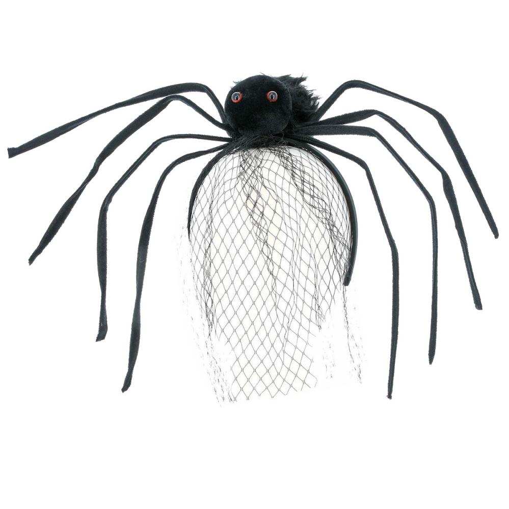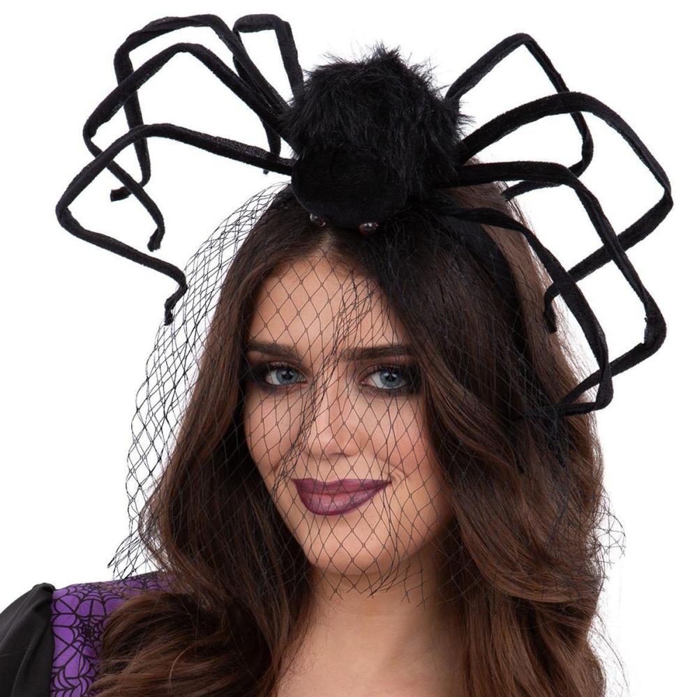 Hårbøjle Kæmpe Edderkop & Slør omfatter en sort stofbetrukket hårbøjle med en stor edderkop og et sort netstof. Edderkoppen har øjne og en fluffy krop, og de otte ben kan formes og justeres for maksimal kreativitet.