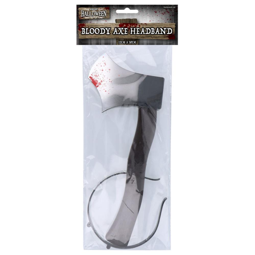 Hårbøjle med Blodig Økse omfatter en sort hårbøjle med en økse, der stikker ud, er aftagelig og har et blodigt sølvfarvet blad samt et brunt håndtag.