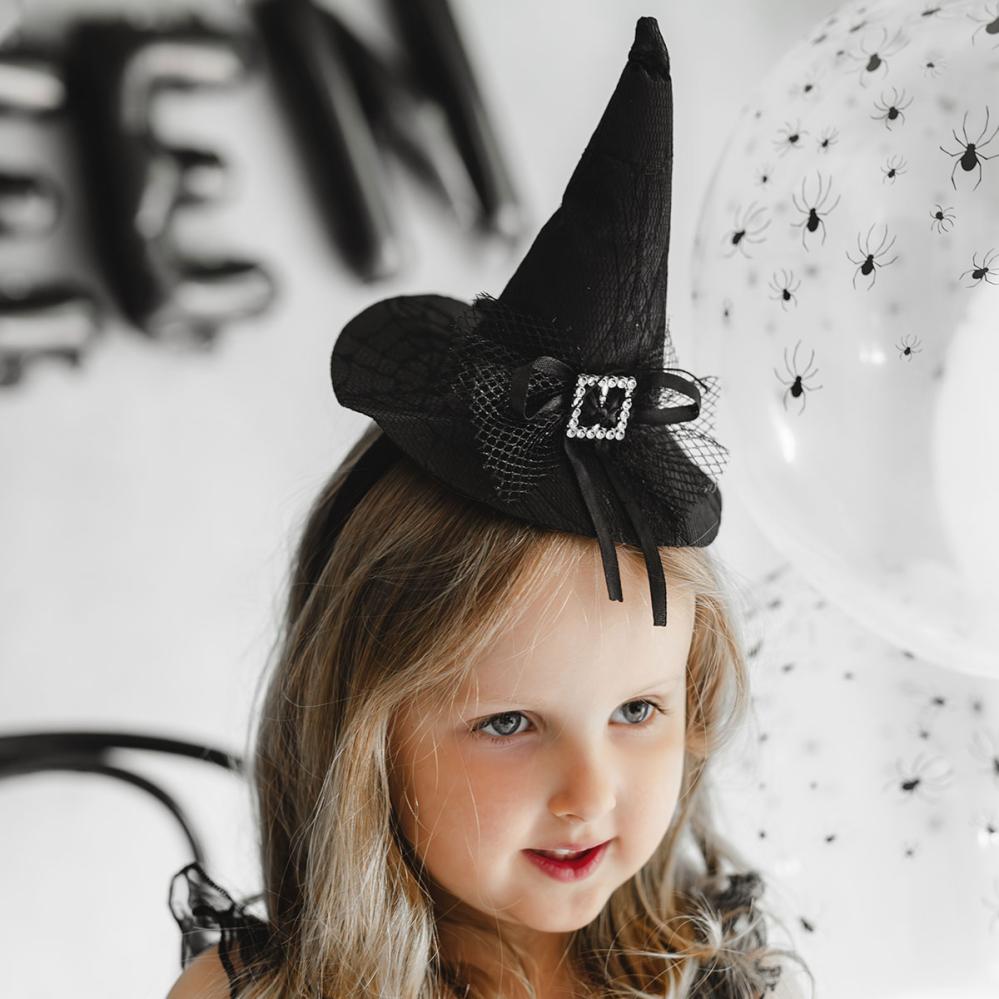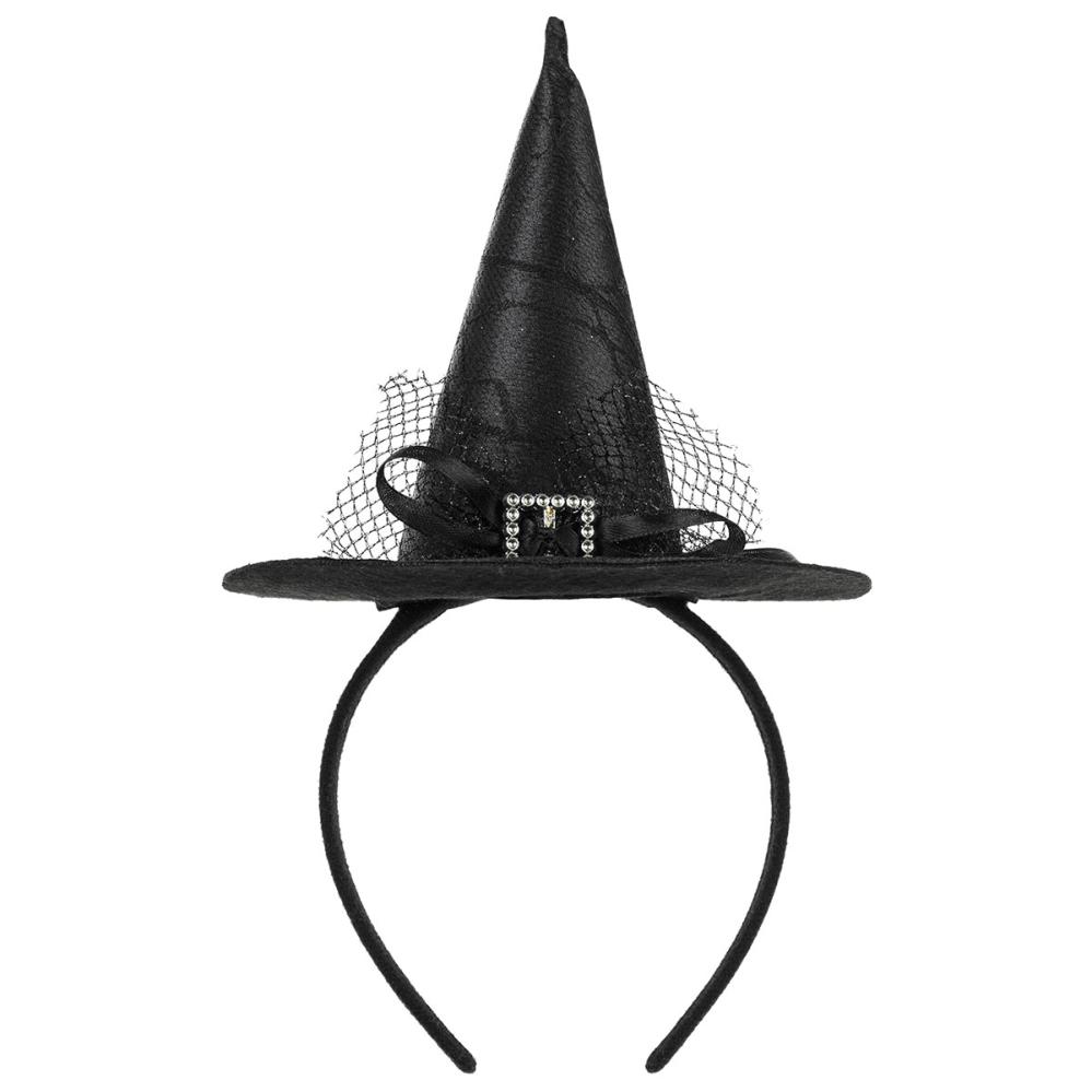 Hårbøjle med Heksehat Sort omfatter en sort hårbøjle i blød polyester med en udstående heksehat.