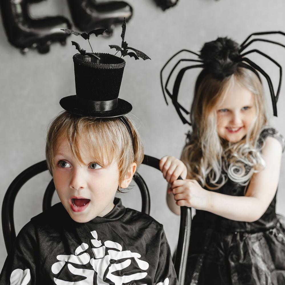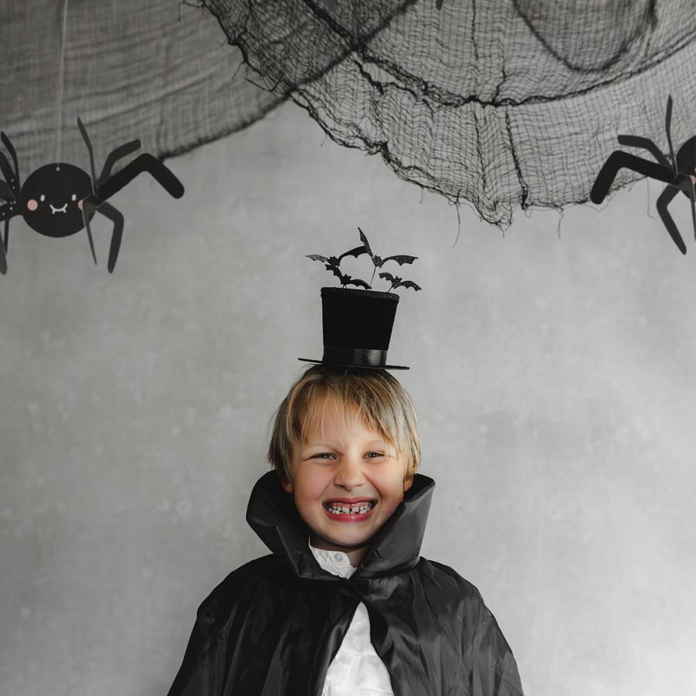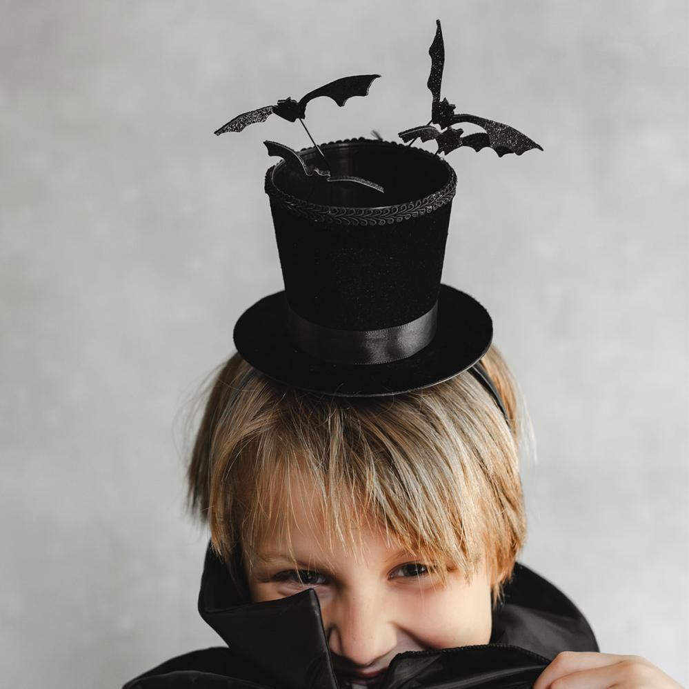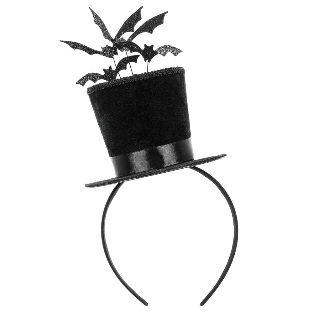 Hårbøjle med Høj Hat & Flagermus omfatter en sort hårbøjle med en udstående høj hat, som er dekoreret med udstående flagermus.