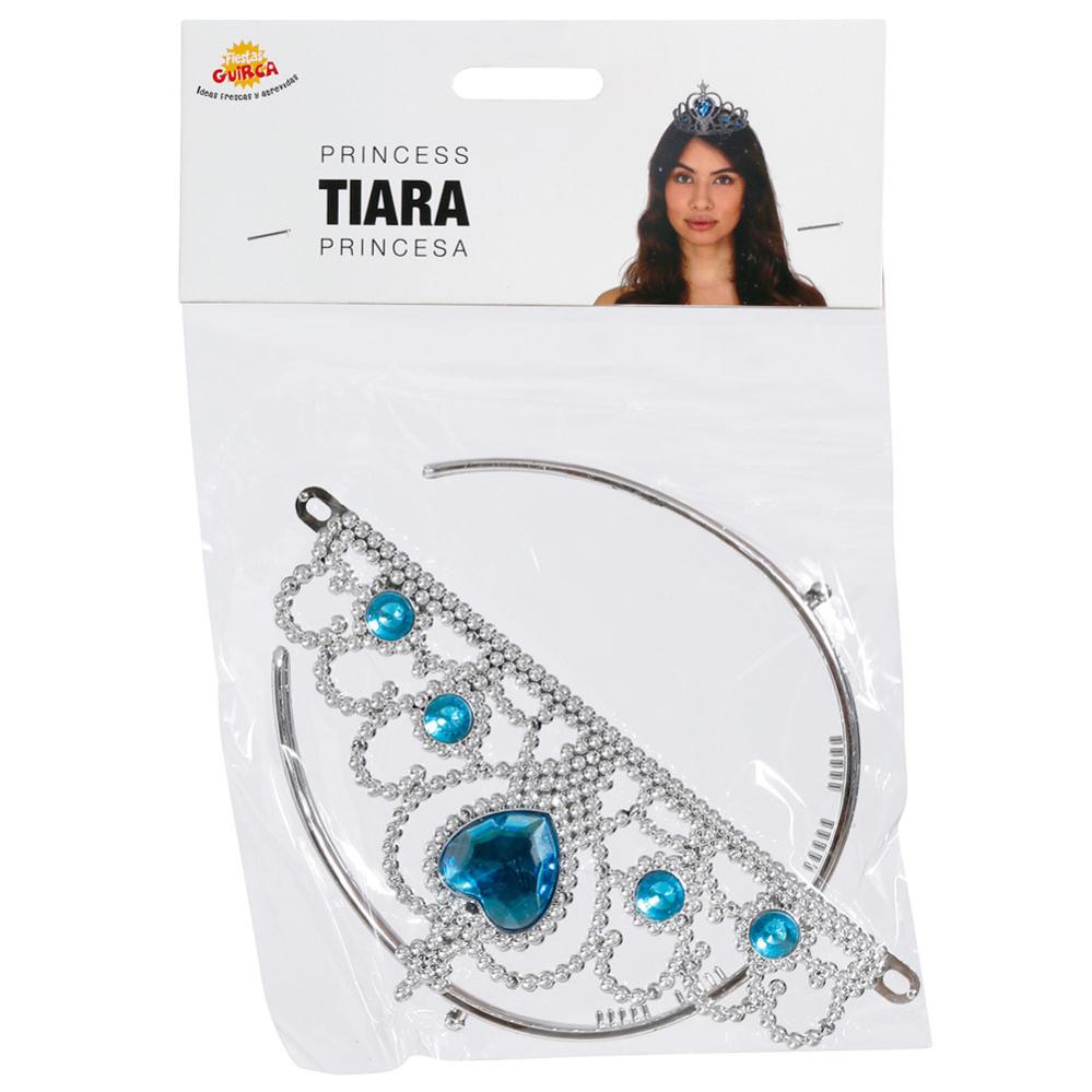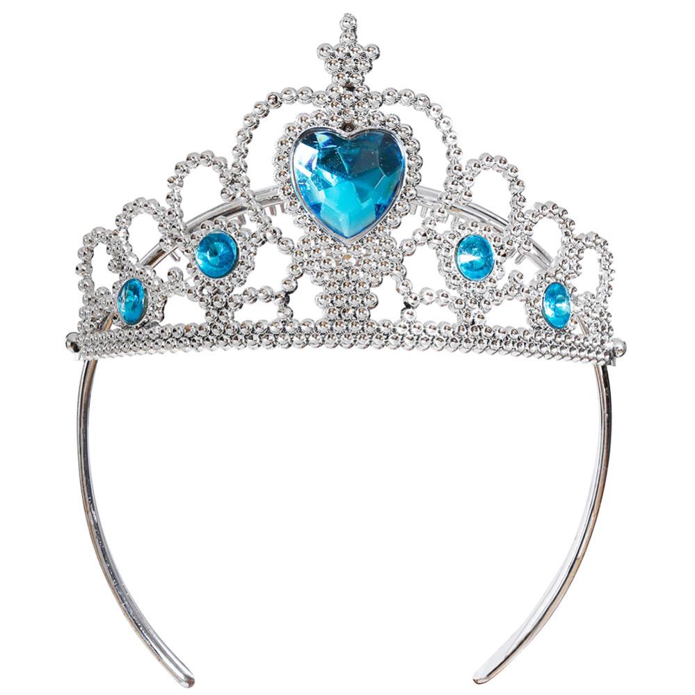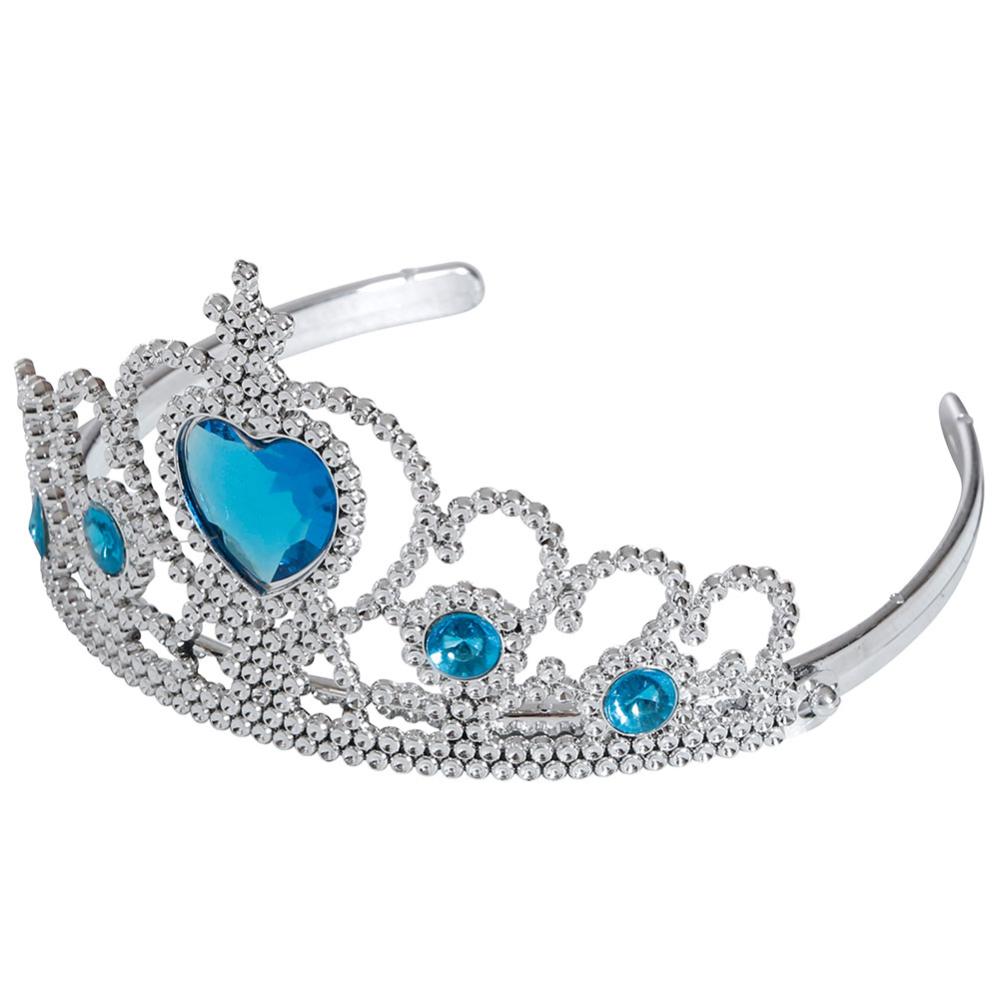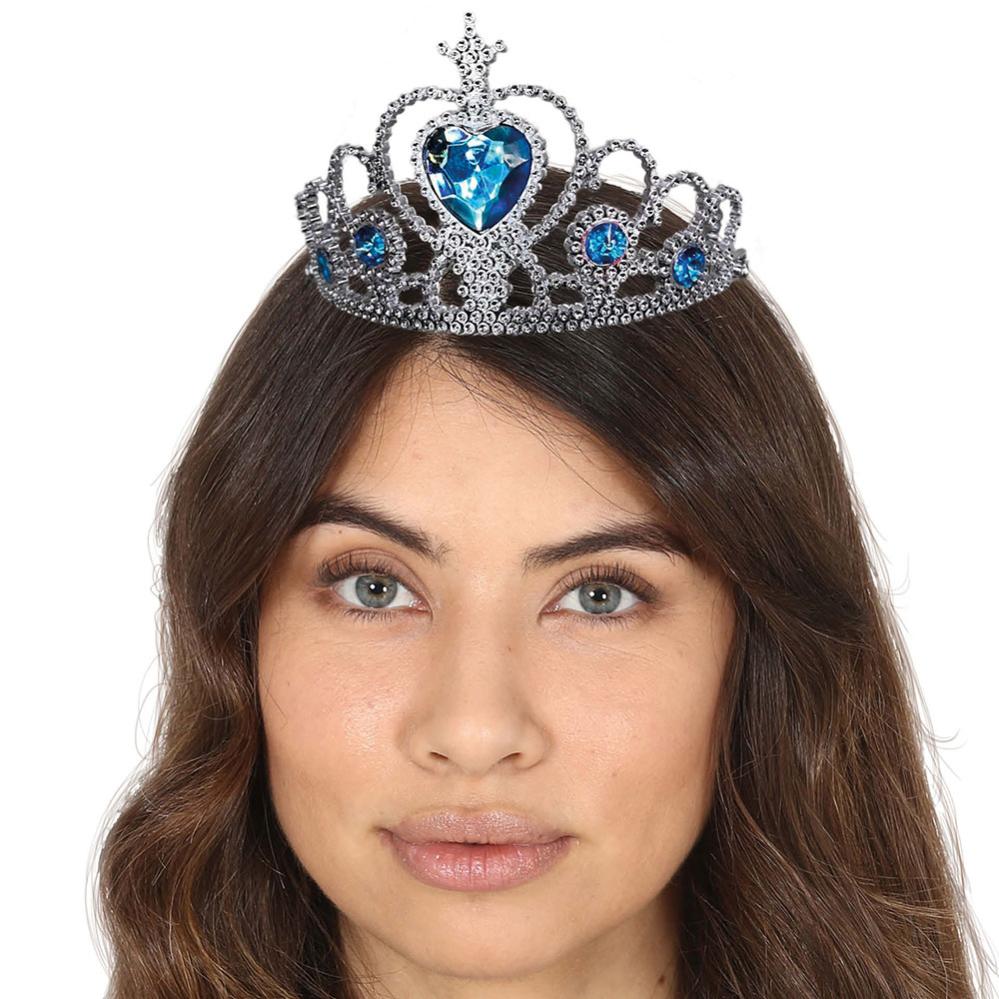 Hårbøjle med Krone Sølv/Blå omfatter en sølvfarvet hårbøjle med en krone der har fire runde juveler og en hjerteformet juvel i blå.