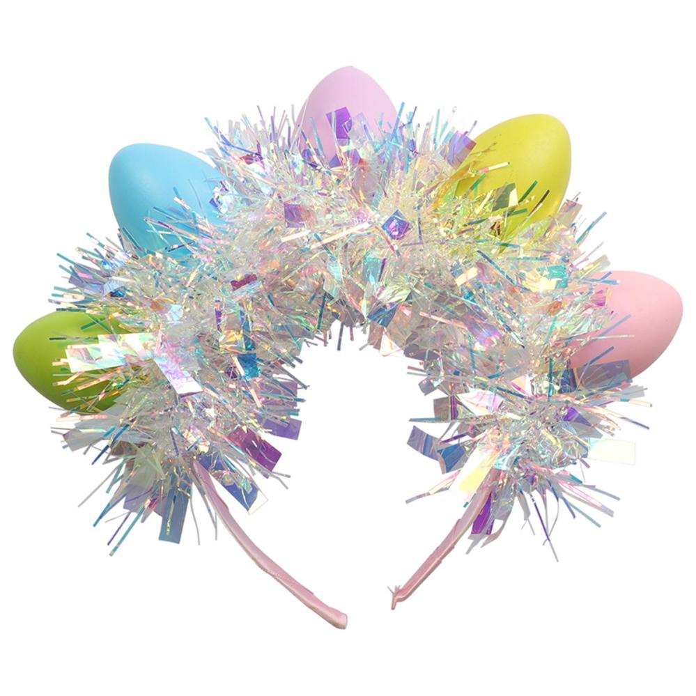 Hårbøjle med Påskeæg og Glimmer omfatter en rosa, stofbeklædt hårbøjle i plast dekoreret med regnbueskinnende tinsel samt fem pastelfarvede påskeæg i grøn, blå, lilla, gul og rosa.