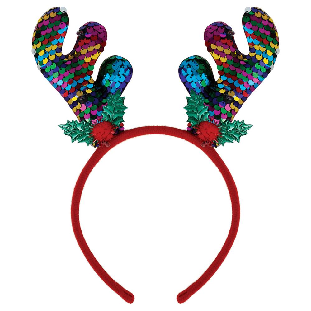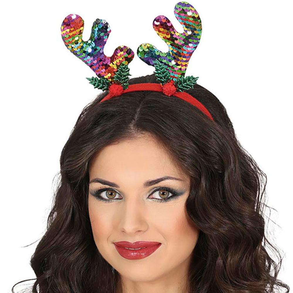 Hårbøjle Rensdyrhorn med Pailletter omfatter en rød, stofbeklædt hårbøjle med rensdyrhorn, som er dekoreret med farverige pailletter på forsiden samt en julemispel under hvert horn. Rensdyrhornene står stabilt takket være en metalspiral, som sidder i hvert enkelt af dem.