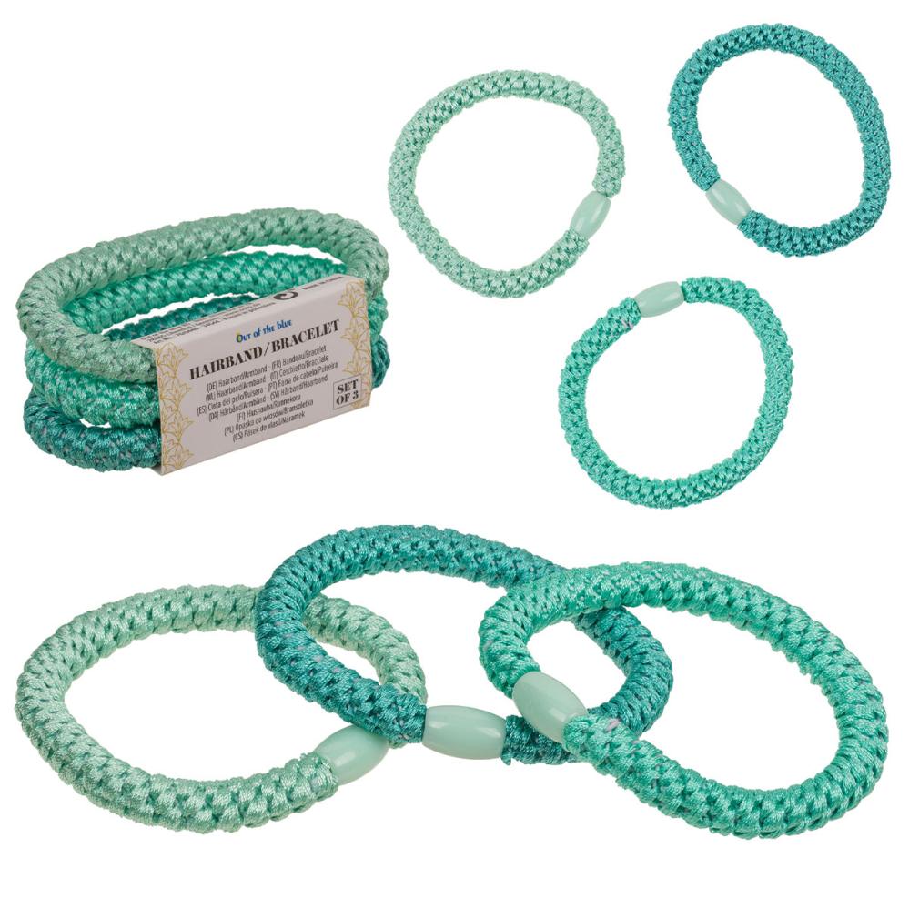Hårelastikker Blå Farvemix 3-pak består af slidstærke hårelastikker i tre bløde blå nuancer med et vævet mønster og en dekorativ detalje på midten. De kan også bruges som stilrene armbånd.