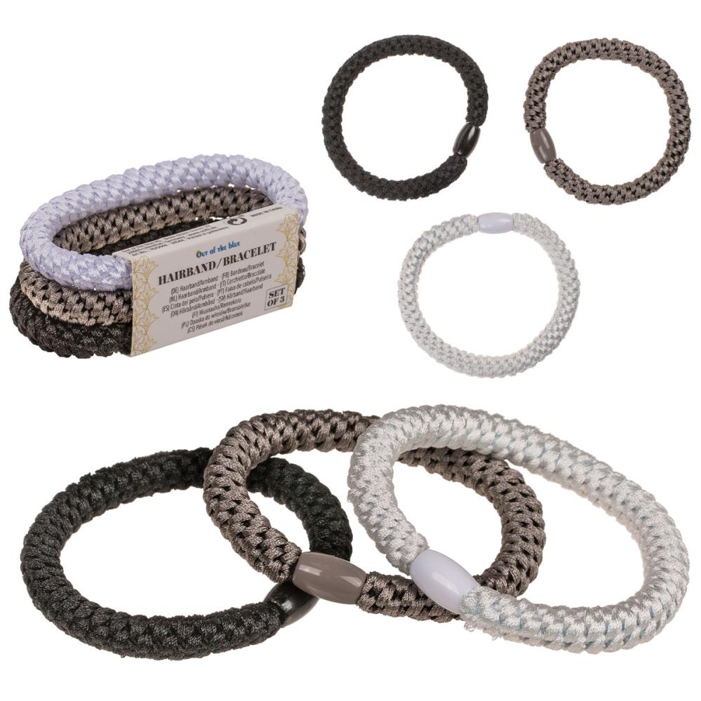 Hårelastikker Sort/Grå/Hvid 3-pak består af tre slidstærke hårelastikker i farverne sort, grå og hvid med et vævet mønster og en dekorativ detalje i midten. De kan også bruges som stilrene armbånd.