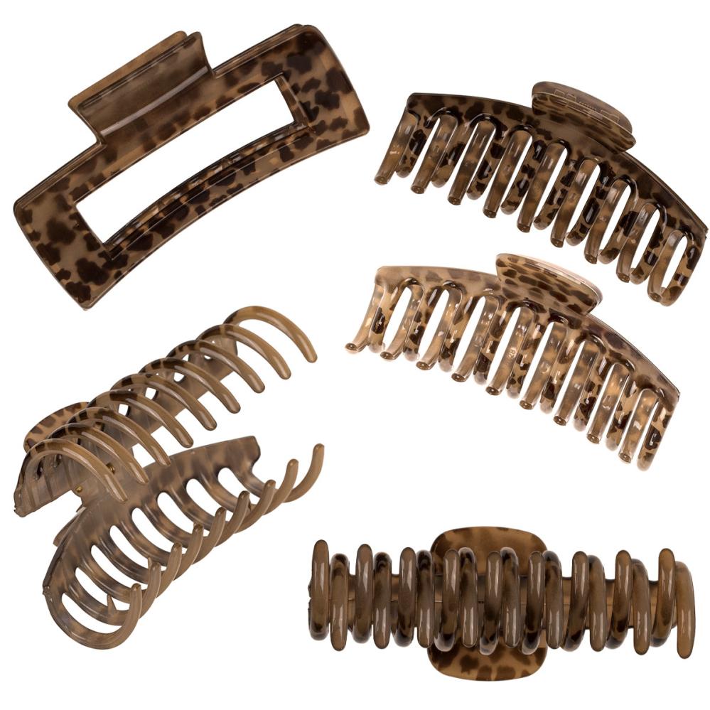 Hårklemmer med Leopardmønster 11 cm 2-pak består af et sæt med to leopardmønstrede hårklemmer, hvoraf den ene har en rektangulær form. Sættet findes i to forskellige farvevarianter: en i brun tone og en i beige tone.