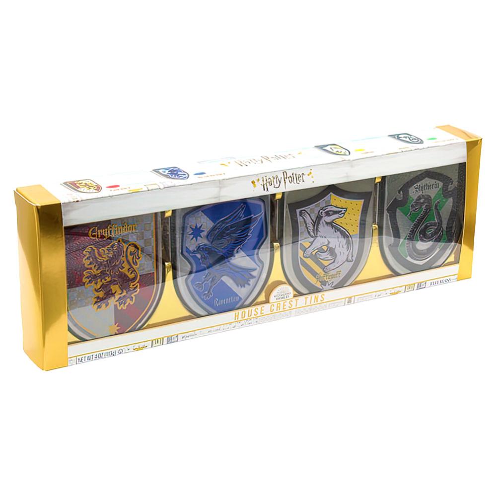 Harry Potter Crest Tins Slikbønner omfatter slikbønner i fire forskellige dåser med motiv af Hogwarts elevhuse. Hver dåse har forskellige smage, Gryffindor har kirsebærsmag, Ravenclaw har blåbærsmag, Hufflepuff har citronsmag og Slytherin har æblesmag. Dåserne kommer også i en flot gaveæske.