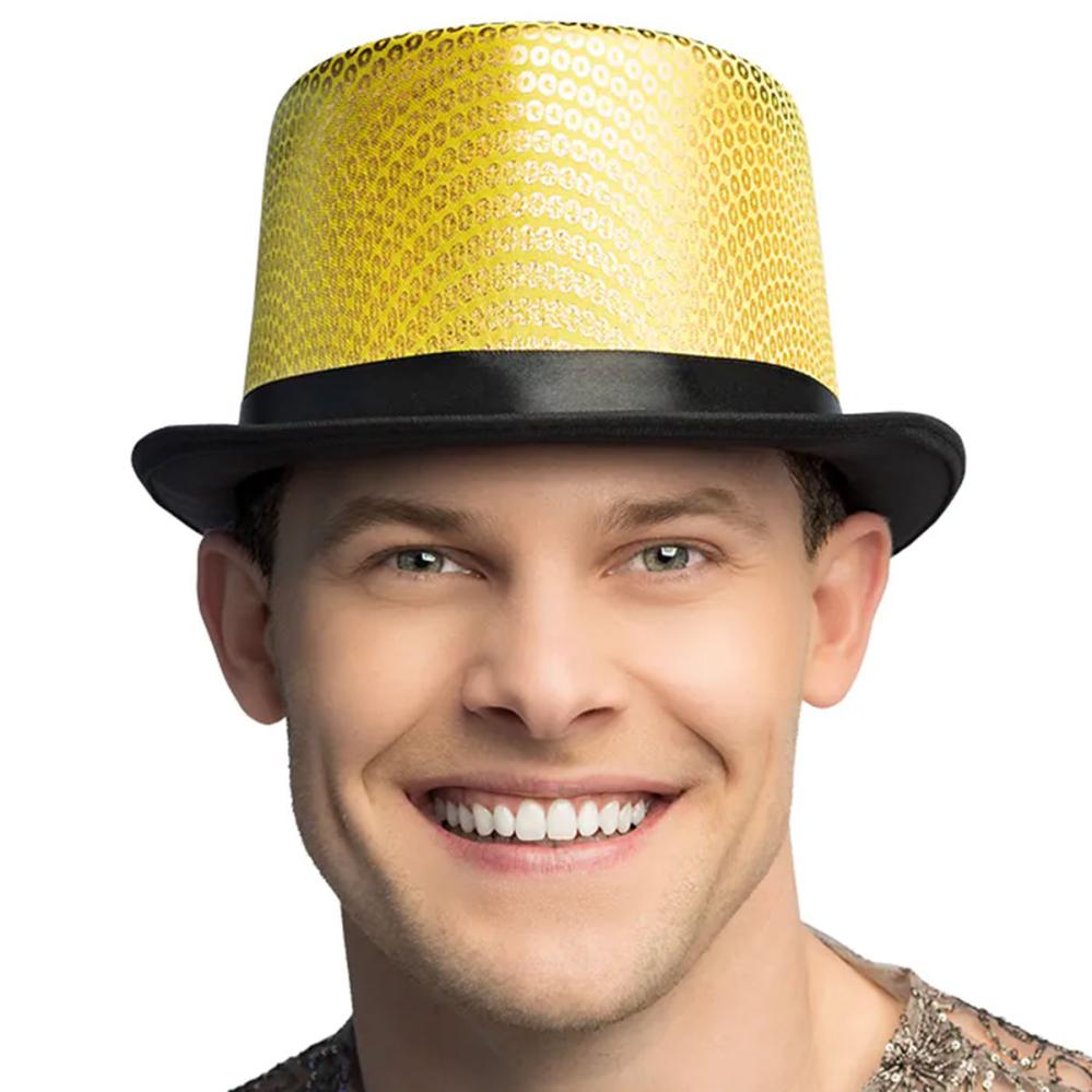 En hat med pailletter i guld passer til udklædning til nytår. Denne nytårshat giver glans til fejringen uden at føles tung. Til nytårsudklædning kombineres den flot med mørke detaljer og enkel stil.