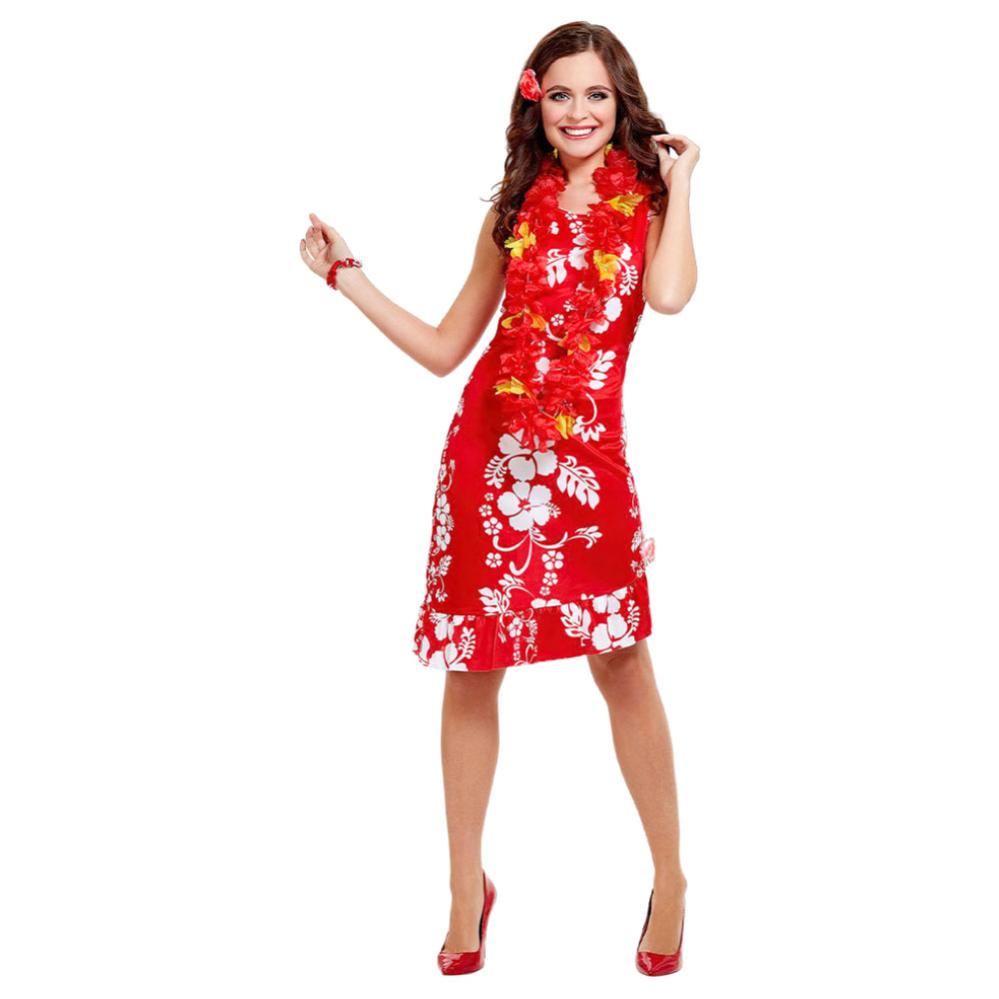 Hawaii Kjole Kostume omfatter en knælang rød damkjole med blomsterprint i hvidt, samt et blomsterarmbånd og en hårpynt i form af en blomst.