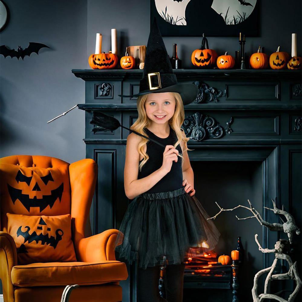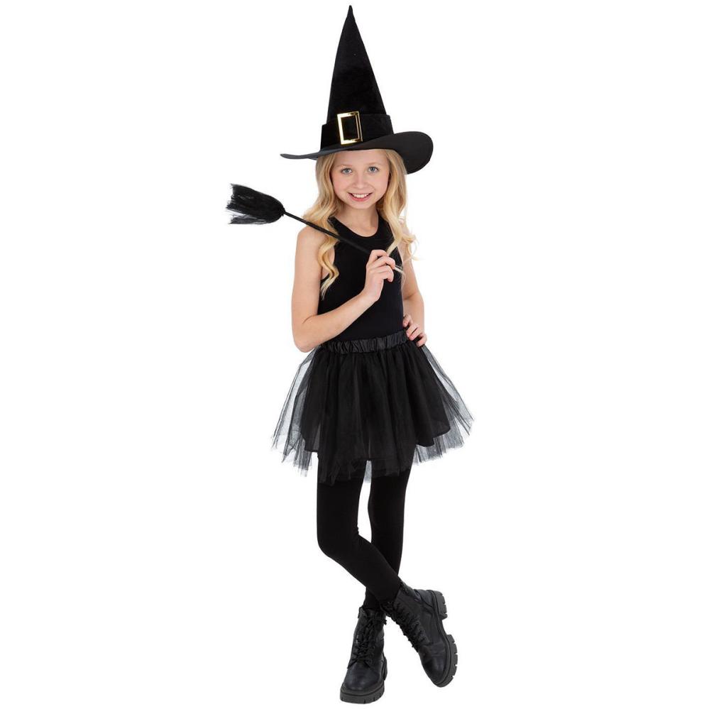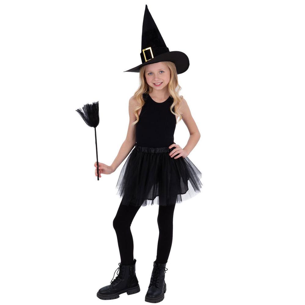 Heks Tilbehørssæt til Børn omfatter et sæt, der indeholder et sort tylskørt, en sort heksehat med et gyldent spænde samt en lille, sort heksekost.