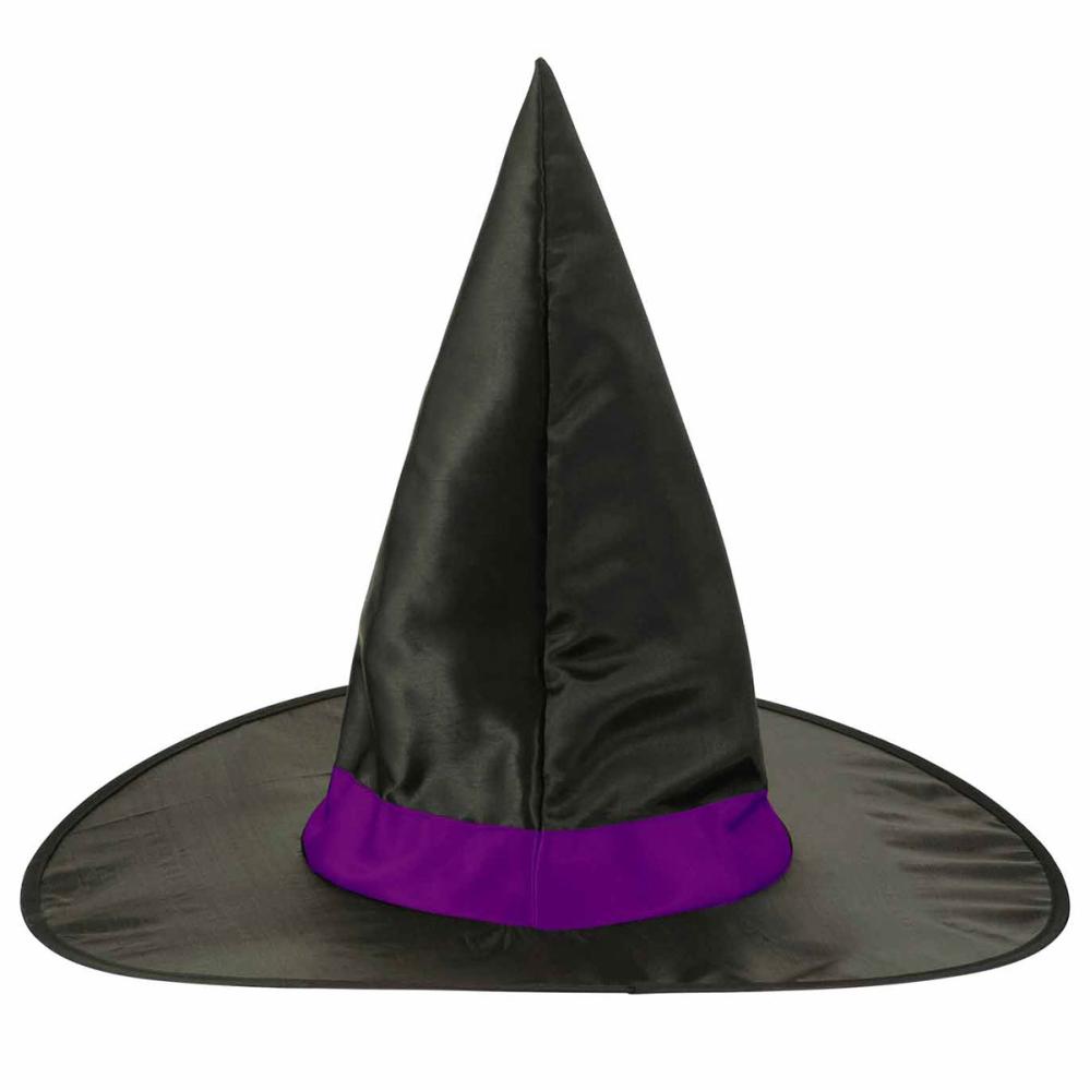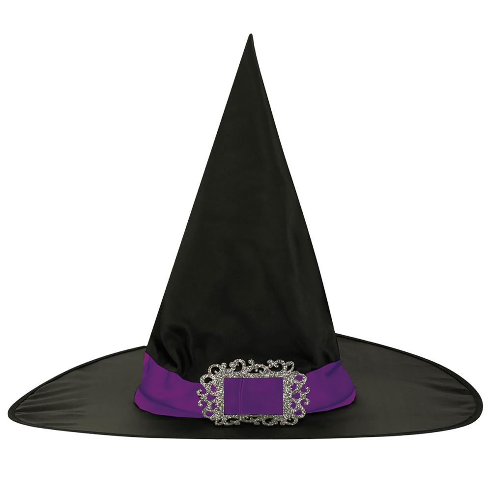 En sort heksehat til en voksen person med et stilrent lilla bånd og et skimrende sølvspænde gør dig klar til Halloween. Den er perfekt som udklædningshat til en halloweenheks og holder stilen hele natten.