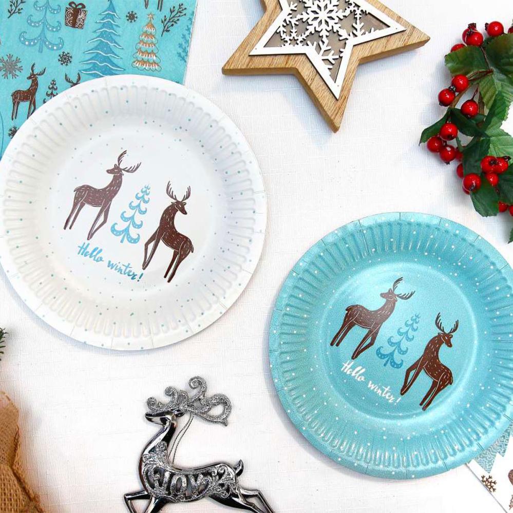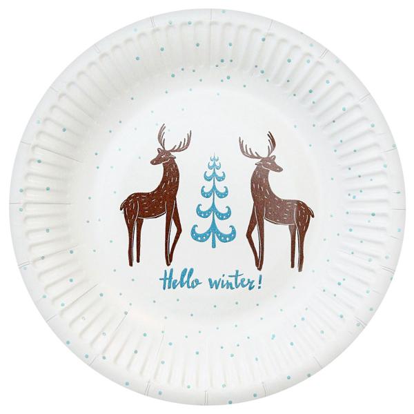 Hello Winter Papirassietter 6-pak indeholder seks hvide papirassietter, dekoreret med to brune rensdyr, en blå gran, blå prikker og teksten "Hello Winter" i blåt.