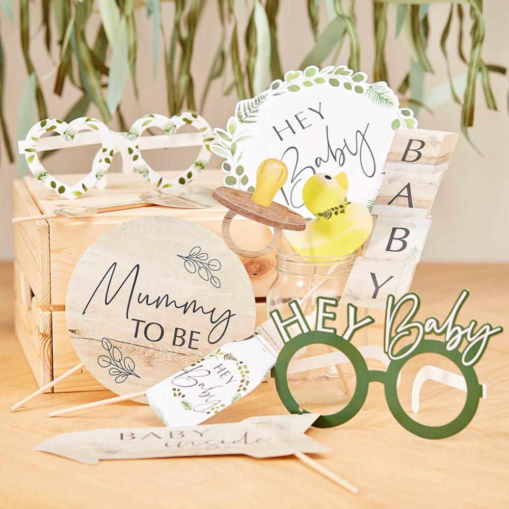 Hey Baby Photo Booth Props inkluderer et sæt med 10 baby shower foto props i træ og pap i grønt, hvidt, træfarvet og gult, som er fastgjort på træpinde. Motiverne inkluderer blandt andet en sutteflaske, en sut, skilte og briller med tekster som Hey Baby, Baby inside og Mummy to be. Det største motiv måler ca. 23 cm bredt og 36 cm højt.