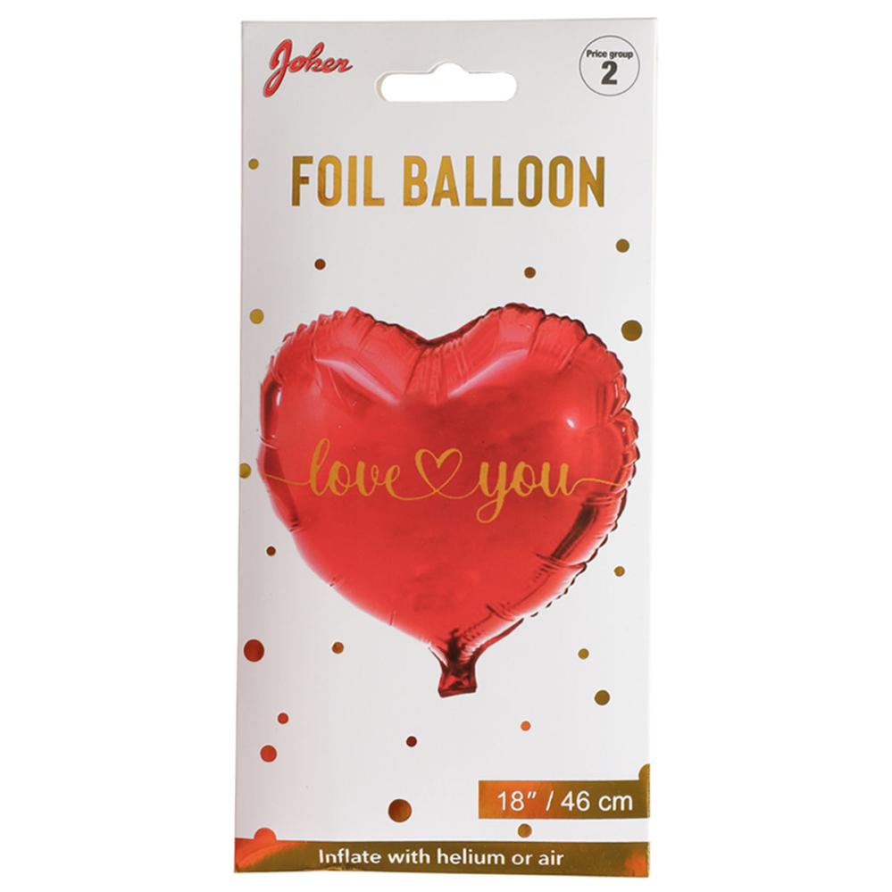 Hjerte Folieballon I Love You 46 cm er en folieballon formet som et rødt hjerte med teksten "Love you" i skinnende guldfarve. Ballonen fyldes med luft med det medfølgende blæserør eller med helium og har øjer til enkel ophængning med den hvide snor som medfølger.
