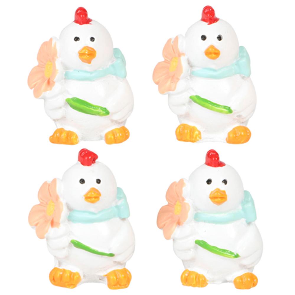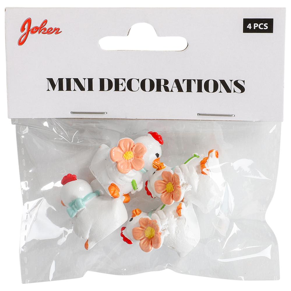 Høne Hvid 2x3 cm 4-pak indeholder små dekorationer i form af hvide høns dekoreret med blomster og sløjfer.