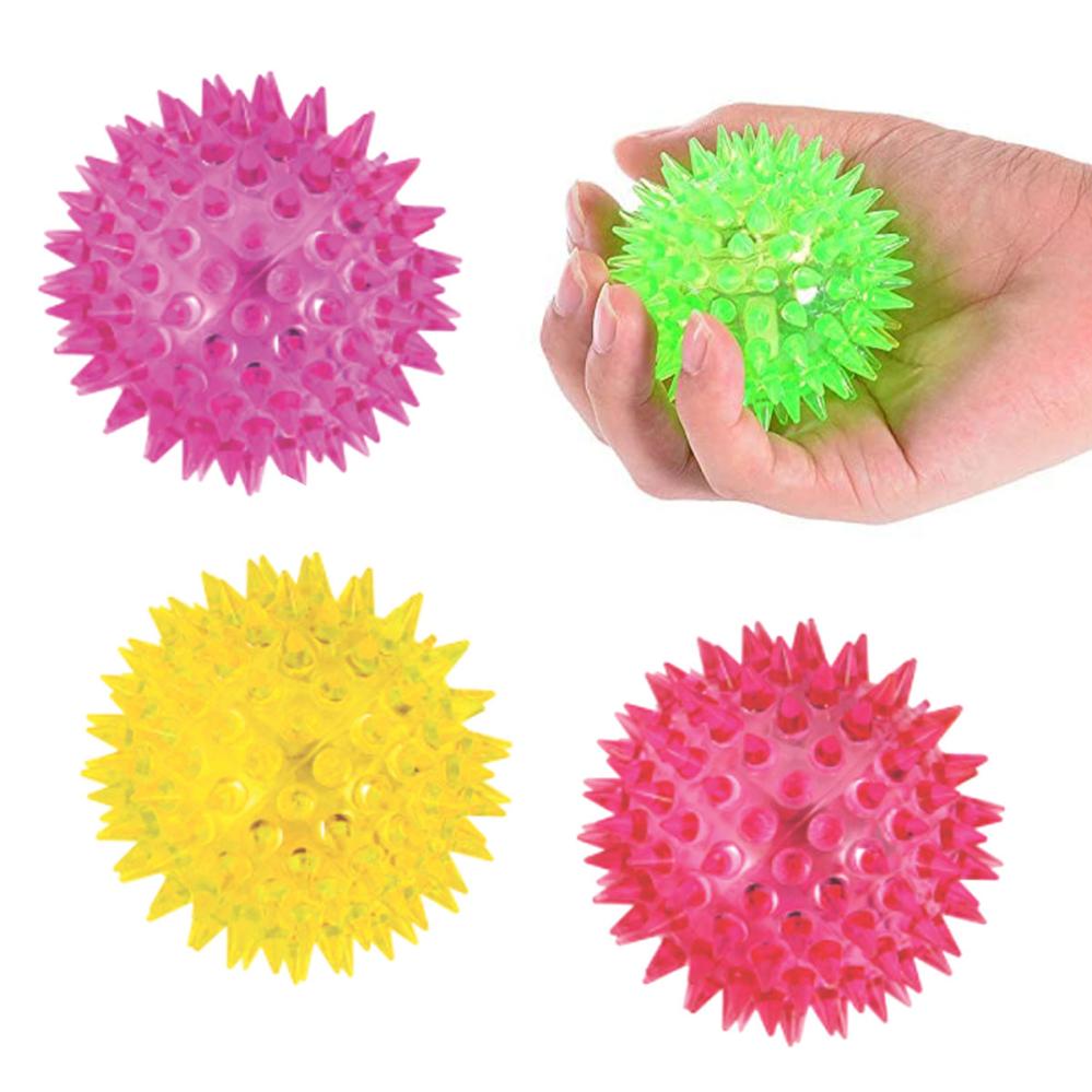 Hoppebold Blinkende omfatter en bold fyldt med væske, skimrende plaststrimler og små lamper, som blinker rødt og blåt, når bolden hopper. Findes i farverne grøn, blå, gul eller lyserød.