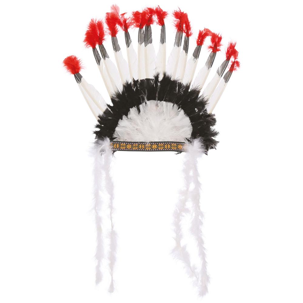 Hovedbeklædning med Fjer Indianer omfatter en hovedbeklædning med sorte, røde og hvide fjer der fastgøres rundt om hovedet med et hvidt elastikbånd.
