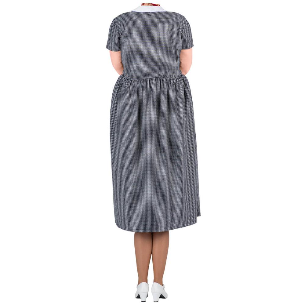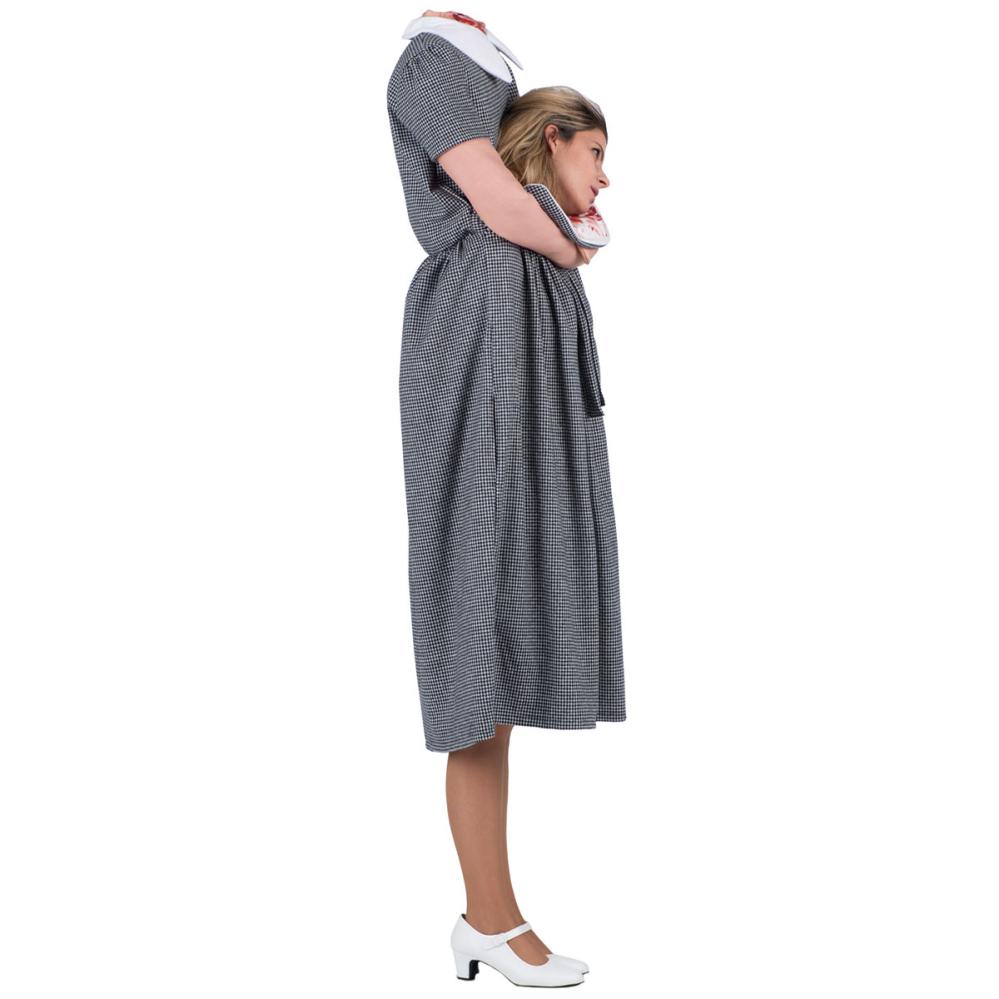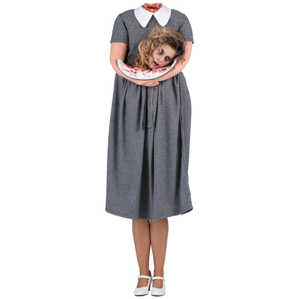 Hovedløs Kvinde Kostume omfatter en sort- og hvidternet kjole med hvid krave, som giver illusionen af, at du holder dit eget hoved i din favn. Der medfølger også instruktioner med trin-for-trin billeder af, hvordan man tager kostumet på.
