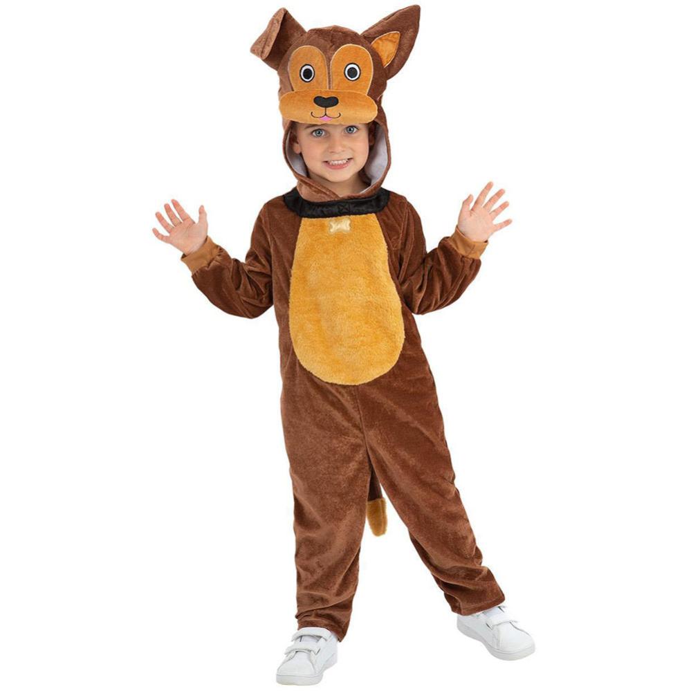 Hundekostume til Børn består af en brun jumpsuit med hætte som forestiller en hund.