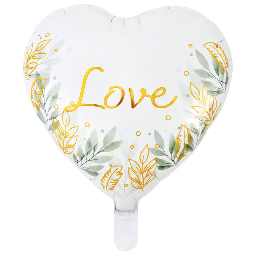 Hvid Folieballon Hjerte Love 46 cm omfatter en hvid, hjerteformet folieballon med grønne plantebladsmotiver og gyldne detaljer samt teksten "Love" i guld.