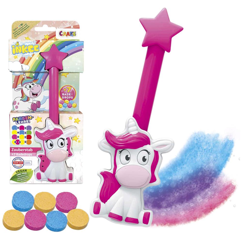 Opdag en farverig oplevelse i badekarret med Inkee Bad Tryllestav Enhjørning. Med syv badedråber i forskellige farver kan du skabe dine egne nuancer. Perfekte badelegetøj og badetilbehør til poolen og badekarret, ligesom en sjov badebombe der også lærer farver.