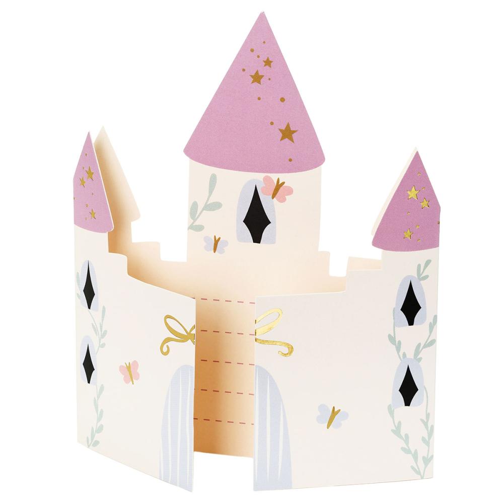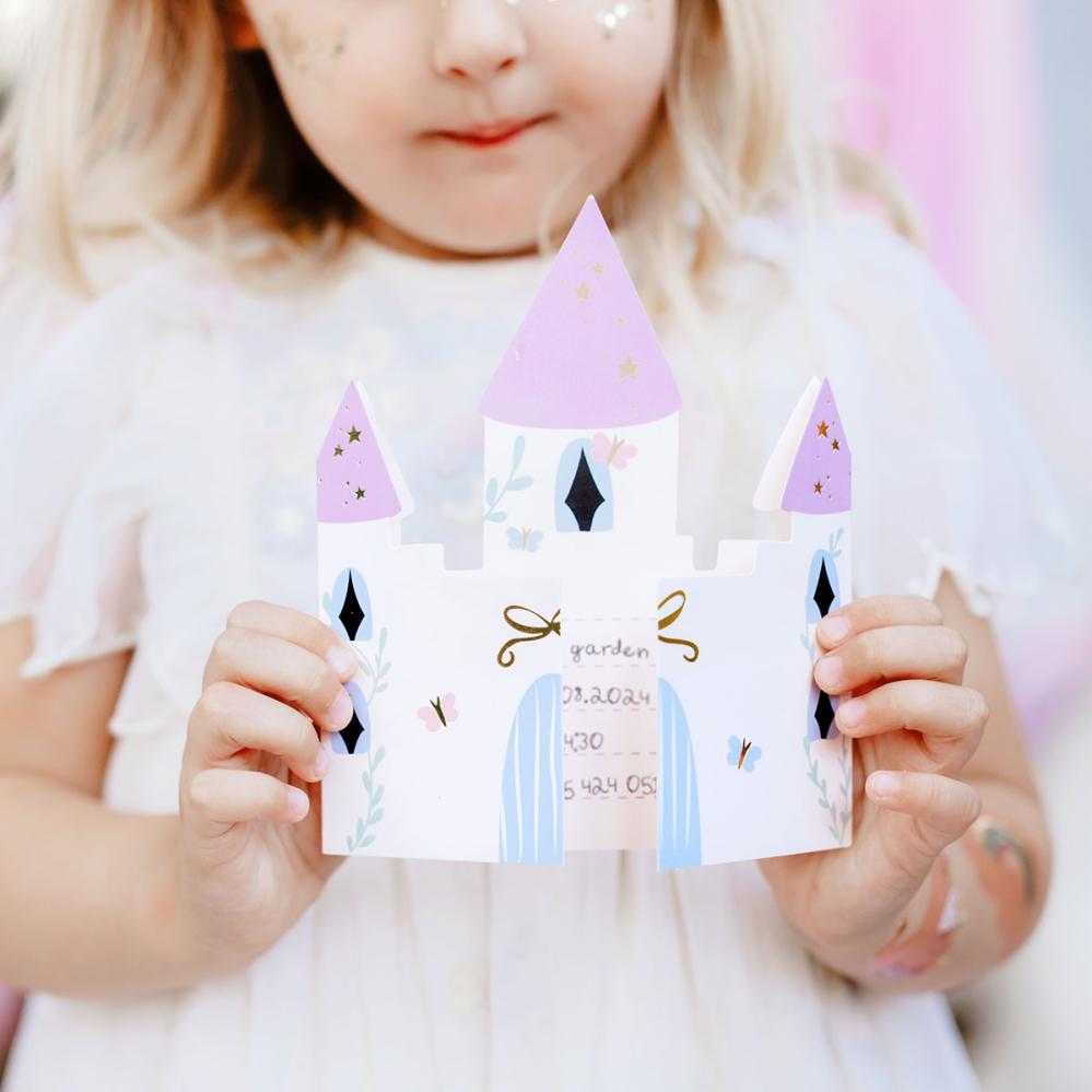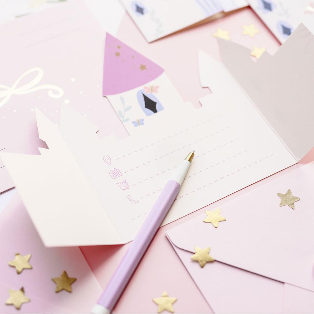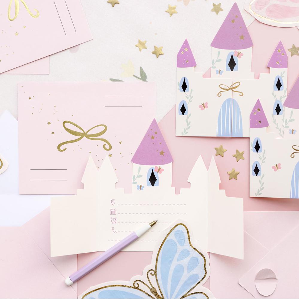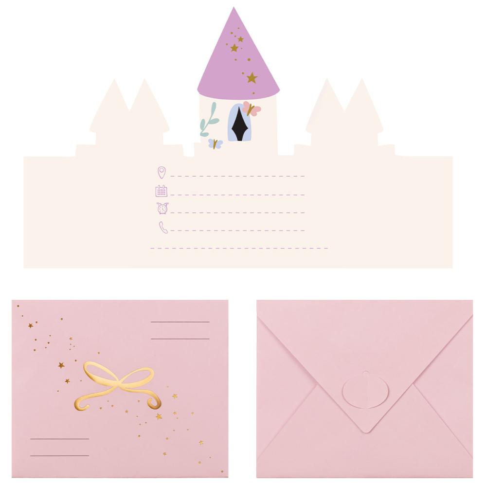 Invitationskort Slot 6-pak indeholder seks foldbare invitationskort med lyserøde kuverter og motiv af et bleg rosa slot, dekoreret med sommerfugle, planter og en sløjfe i skimrende guldfarve. Slottet prydes af tre lavendelrosa tårne med skimrende guldfarvede stjerner. Hvert kort har felter til sted, dato, tid, telefonnummer og øvrigt.