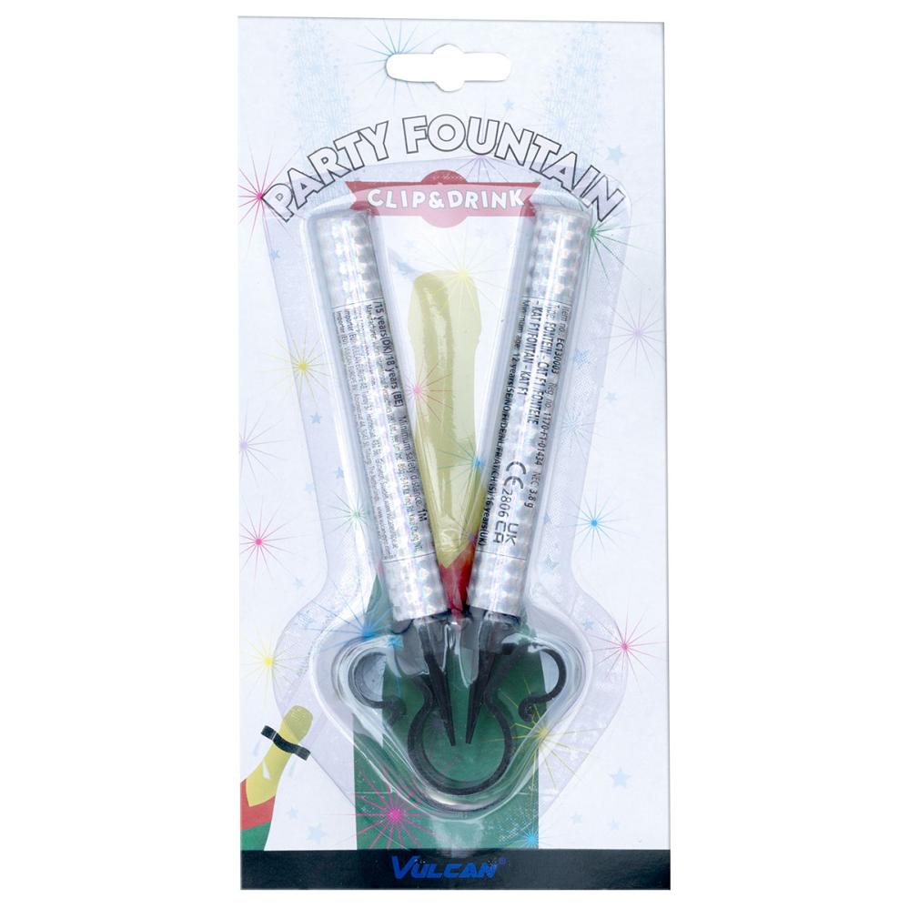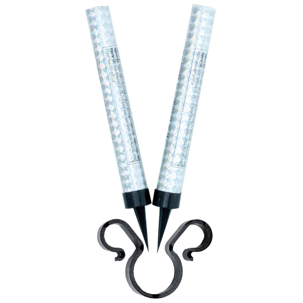 Isfontæner til Flaske 2-pak består af to holografiske isfontæner i sølvfarve som nemt kan fastgøres på en flaske med den medfølgende sorte fastgørelsesanordning.